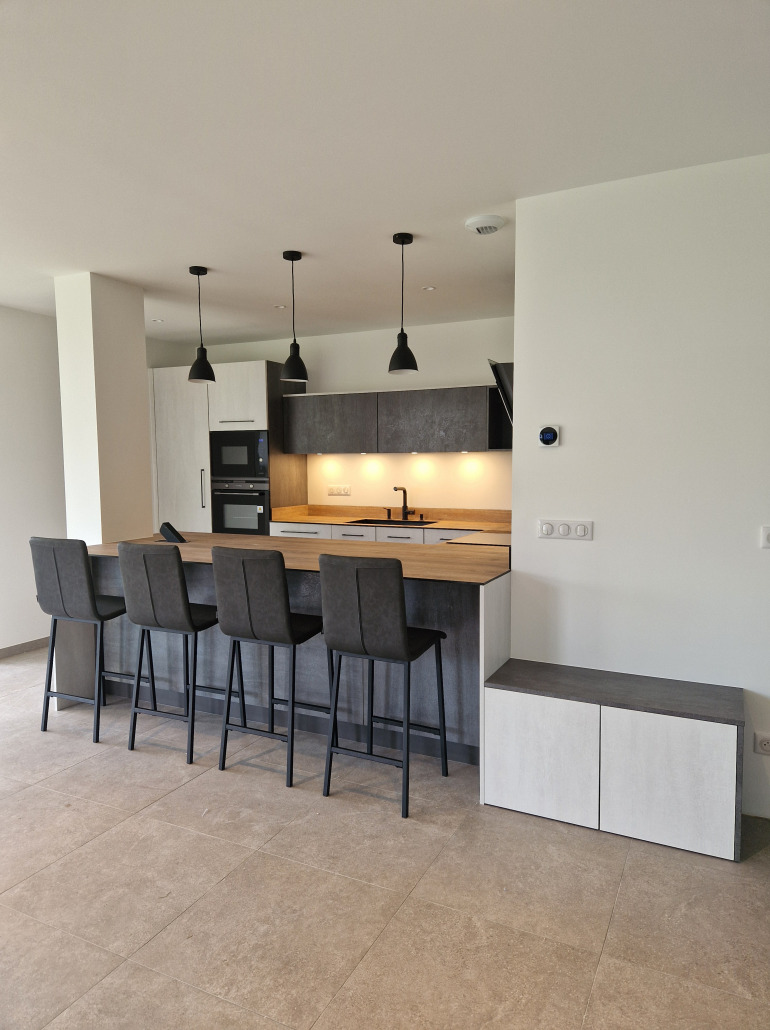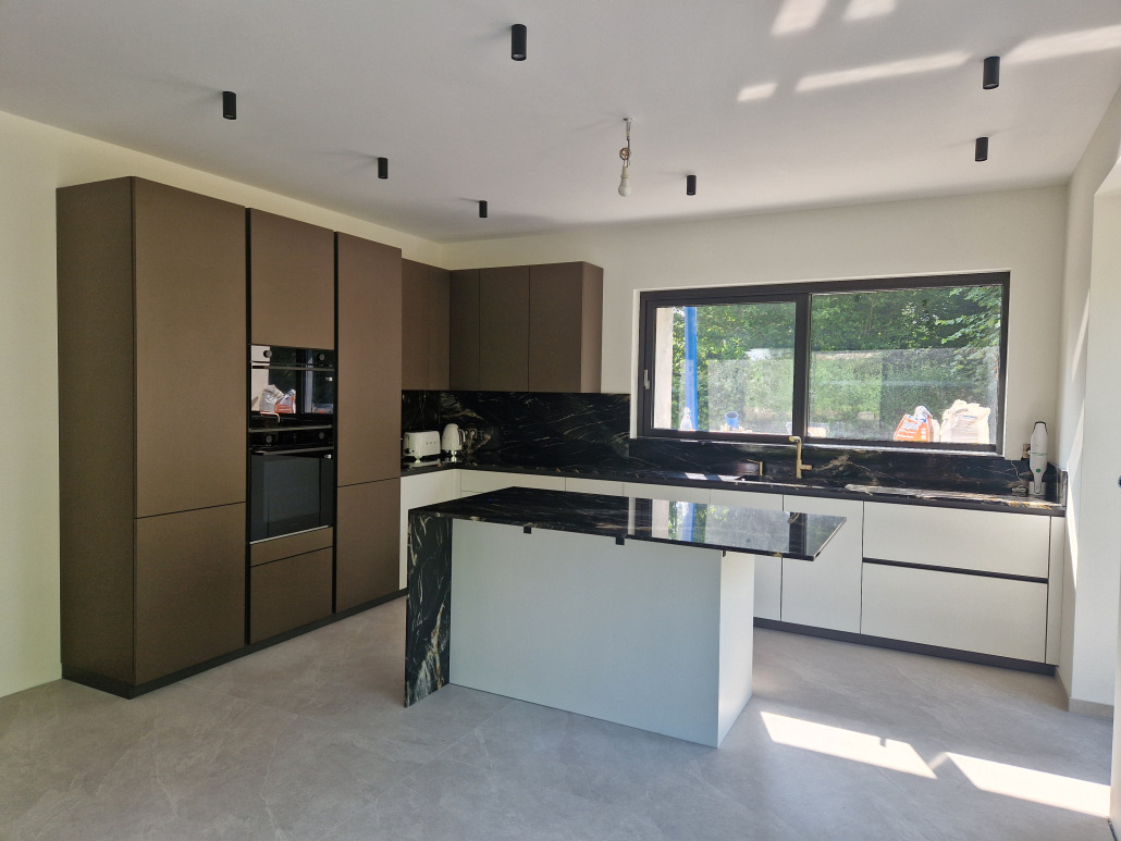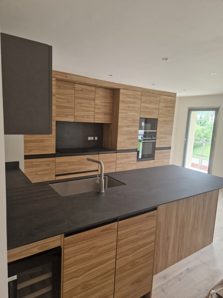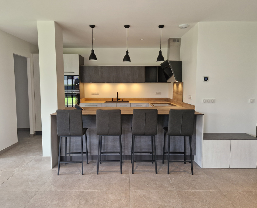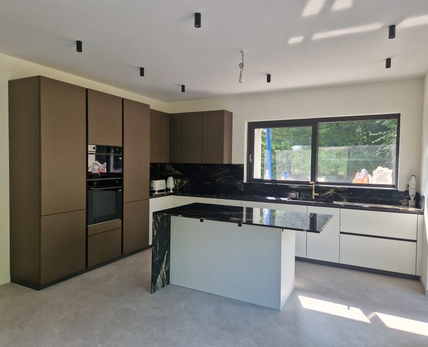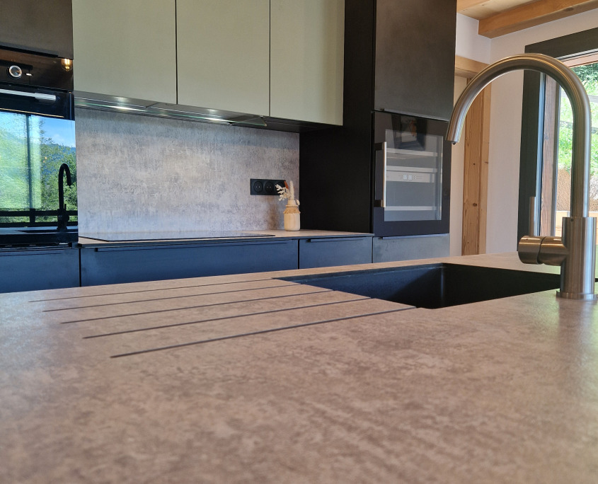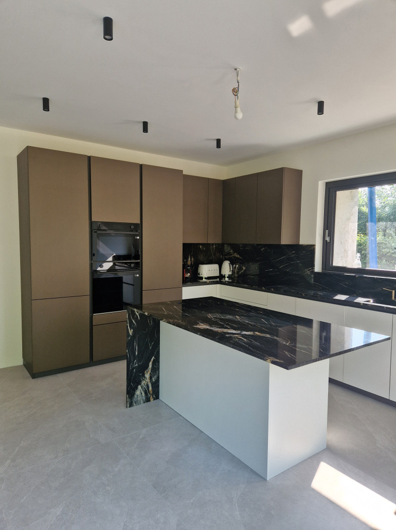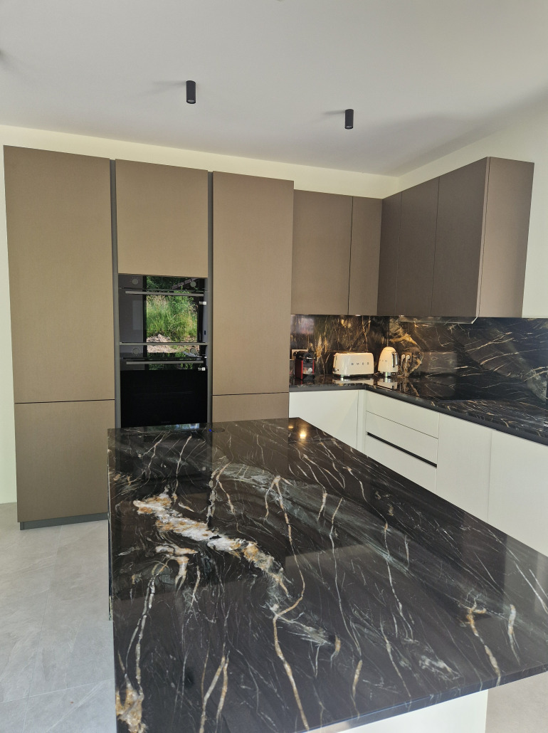 Le plan de travail en Dekton Kelya se prolonge sur un îlot central entièrement habillé du même matériau, véritable pièce maîtresse dédiée à la préparation et à la convivialité.