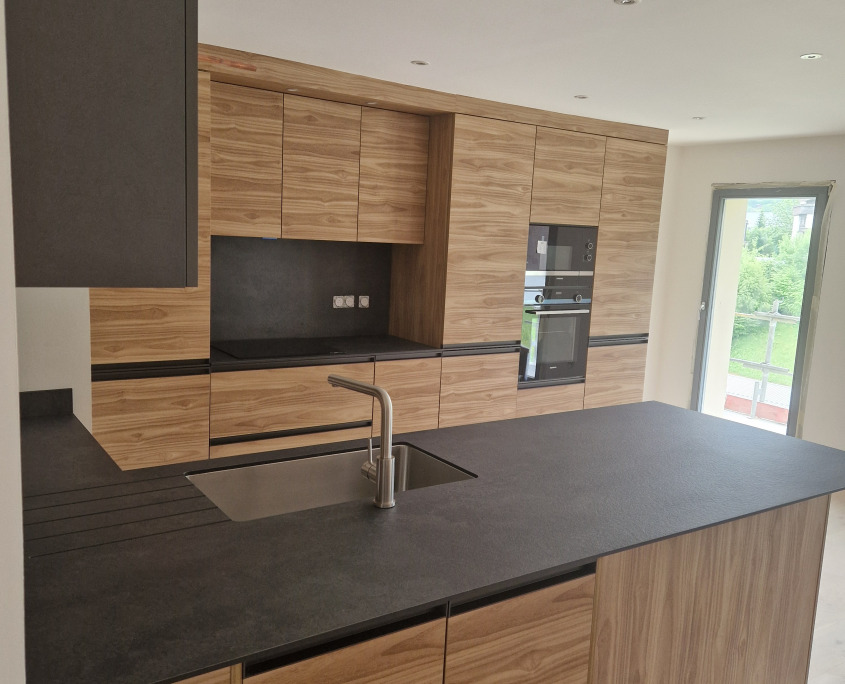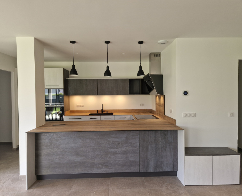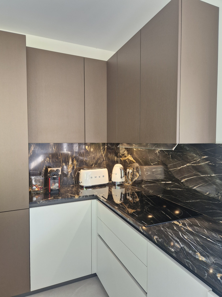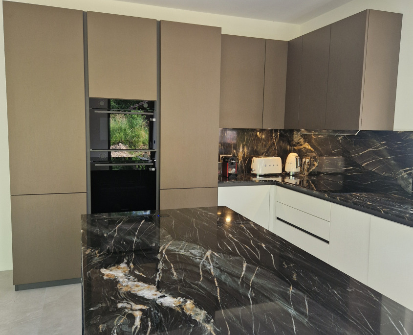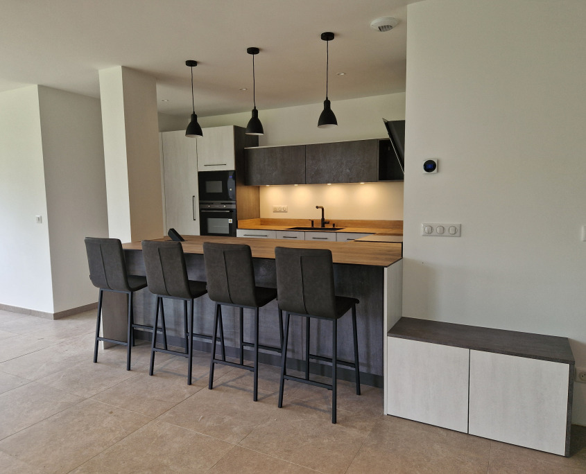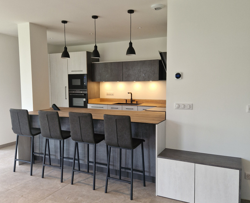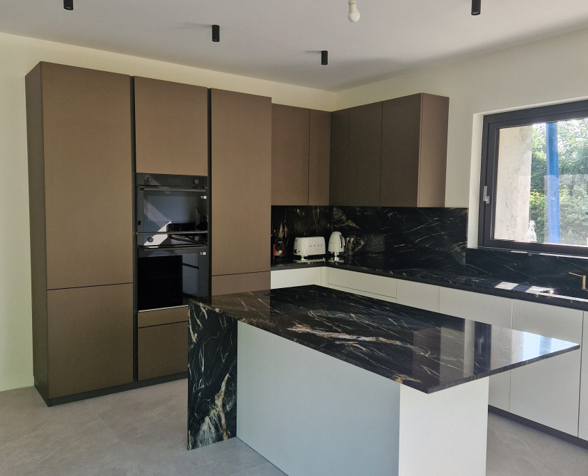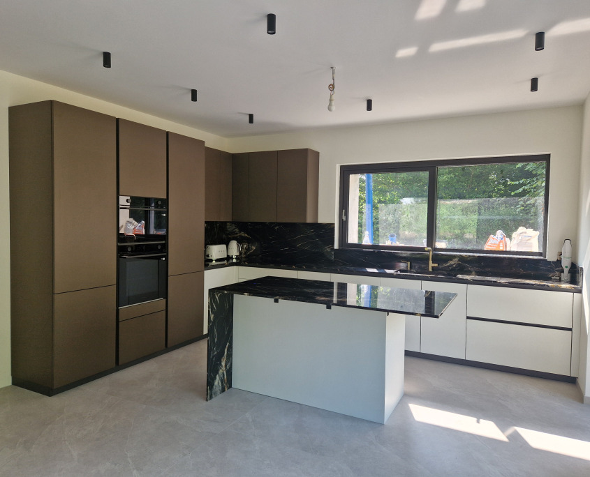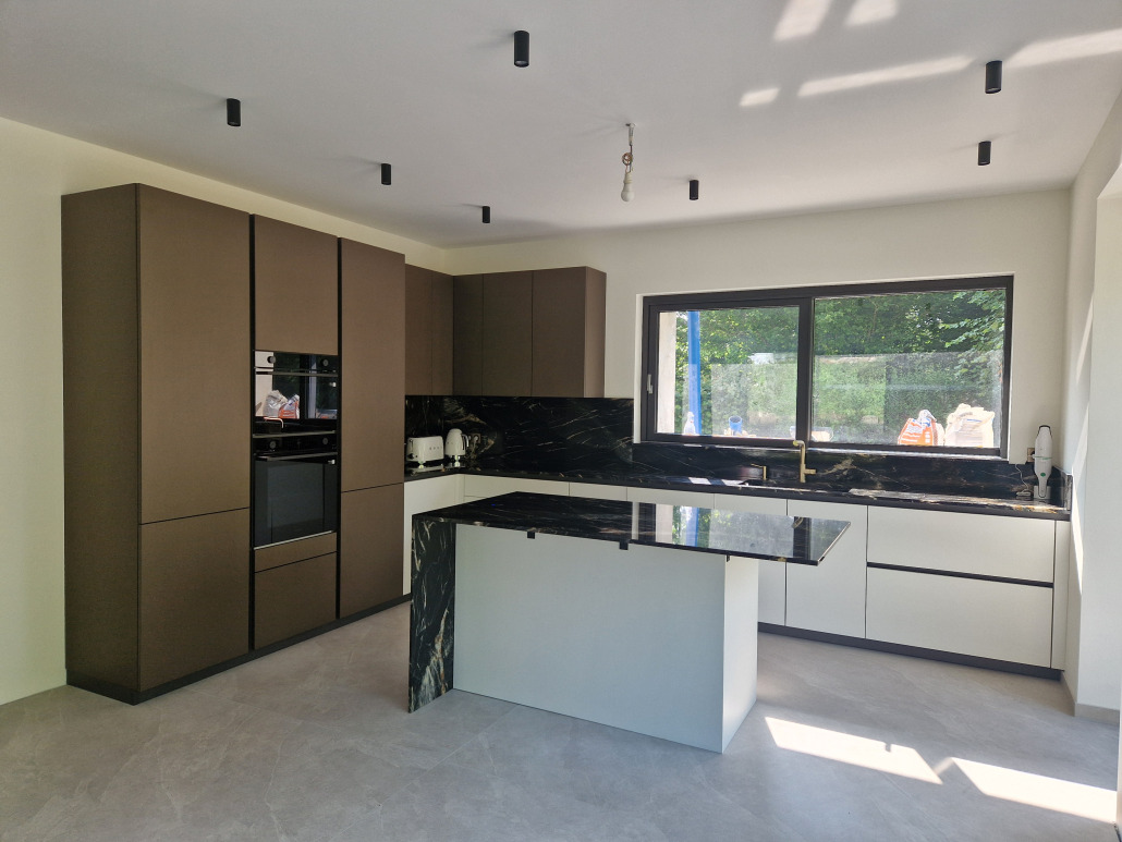 Le plan de travail en Dekton Kelya se prolonge sur un îlot central entièrement habillé du même matériau, véritable pièce maîtresse dédiée à la préparation et à la convivialité.