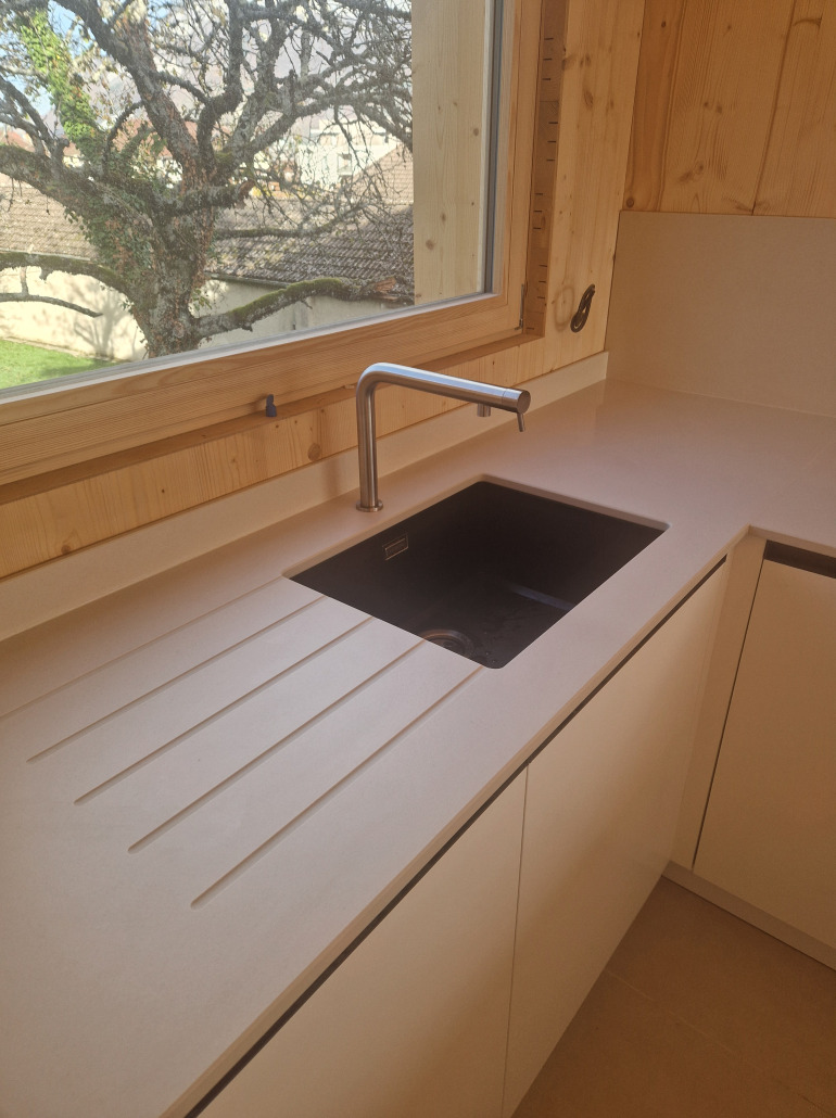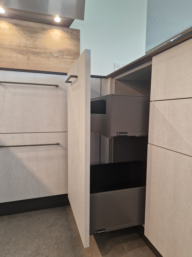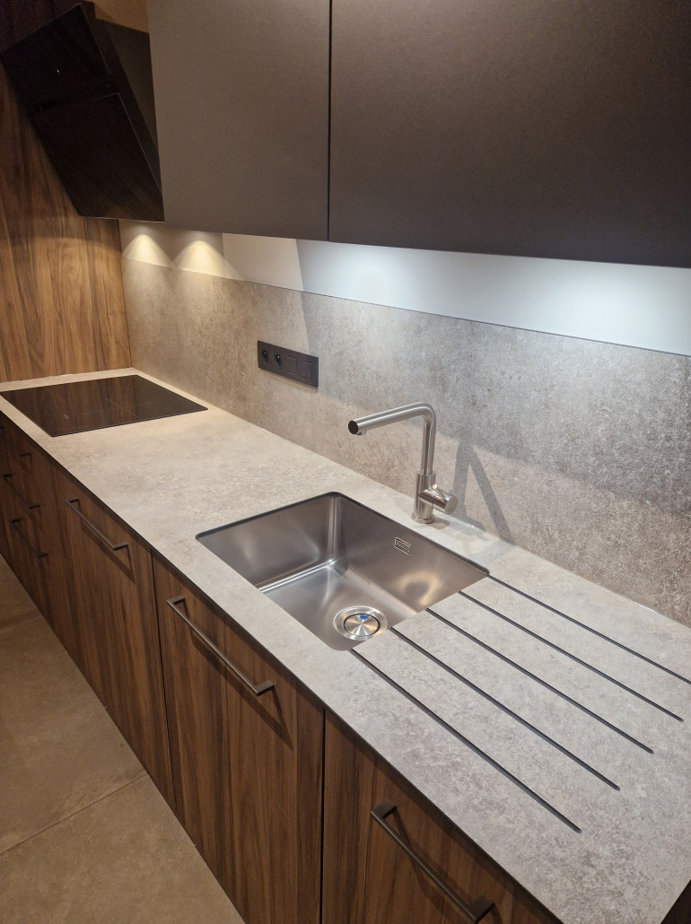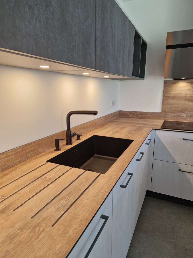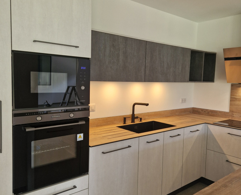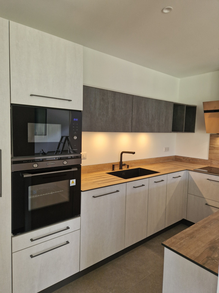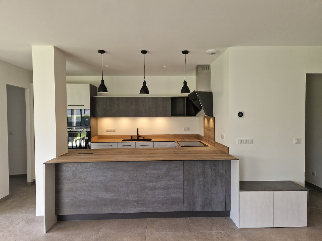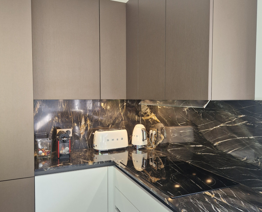 Le plan de travail en Dekton Kelya se prolonge sur un îlot central entièrement habillé du même matériau, véritable pièce maîtresse dédiée à la préparation et à la convivialité.
