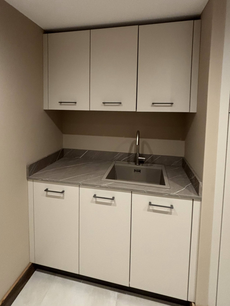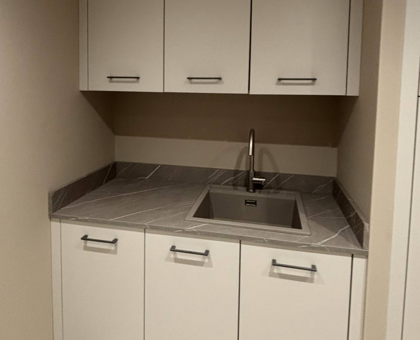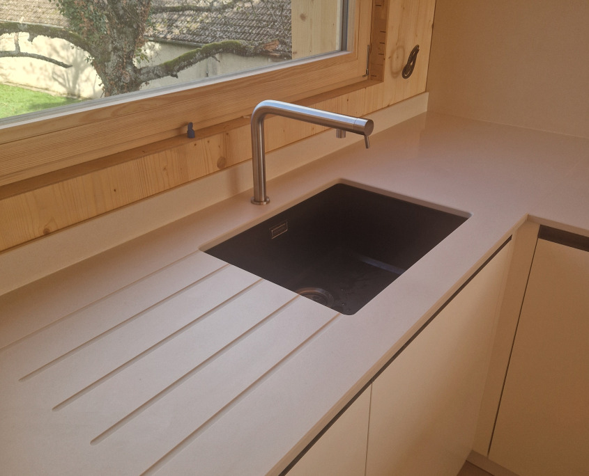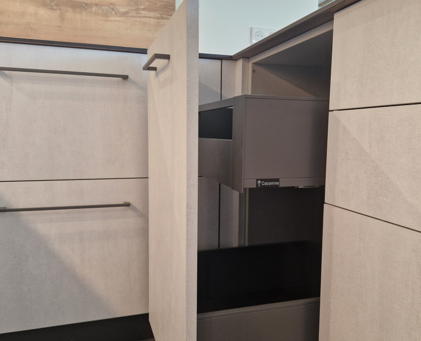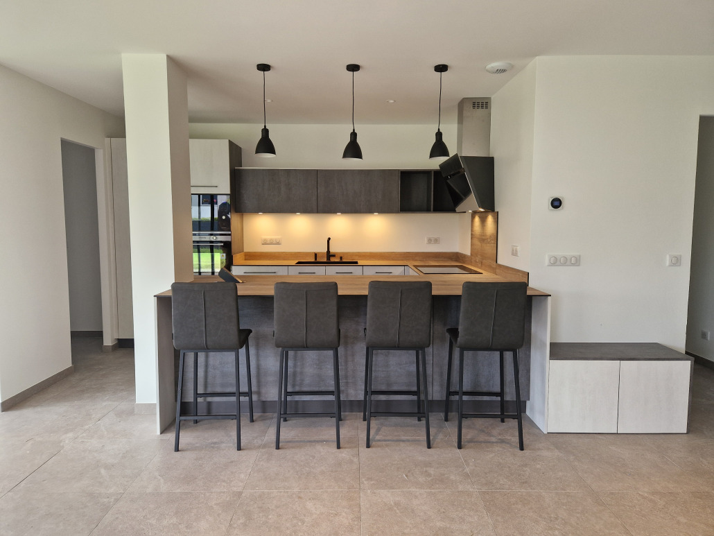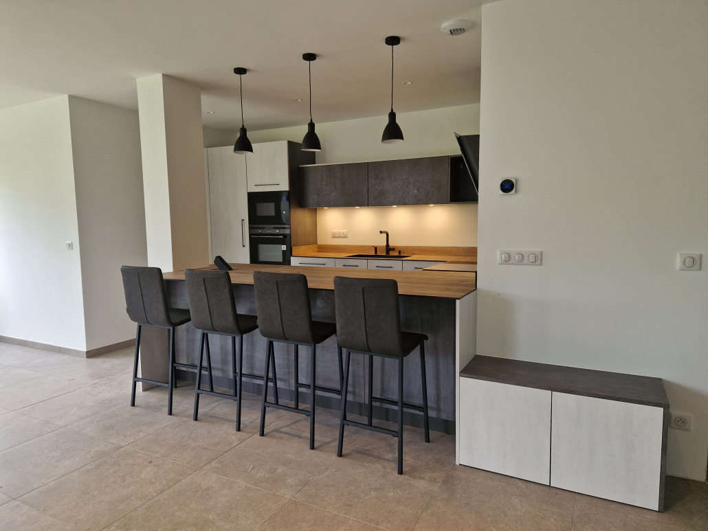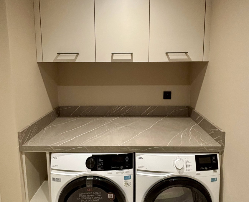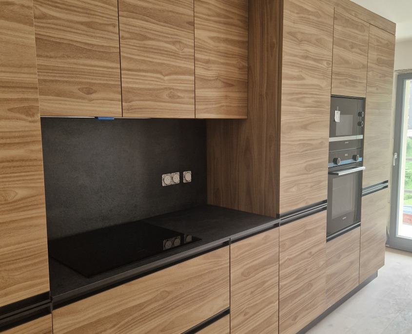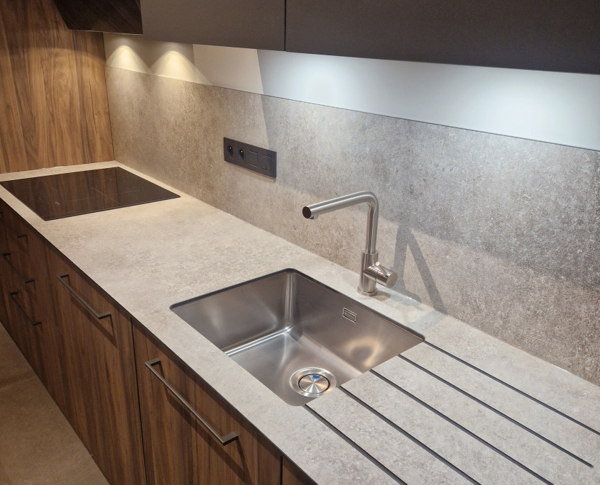 Le plan de travail en Dekton Kelya se prolonge sur un îlot central entièrement habillé du même matériau, véritable pièce maîtresse dédiée à la préparation et à la convivialité.