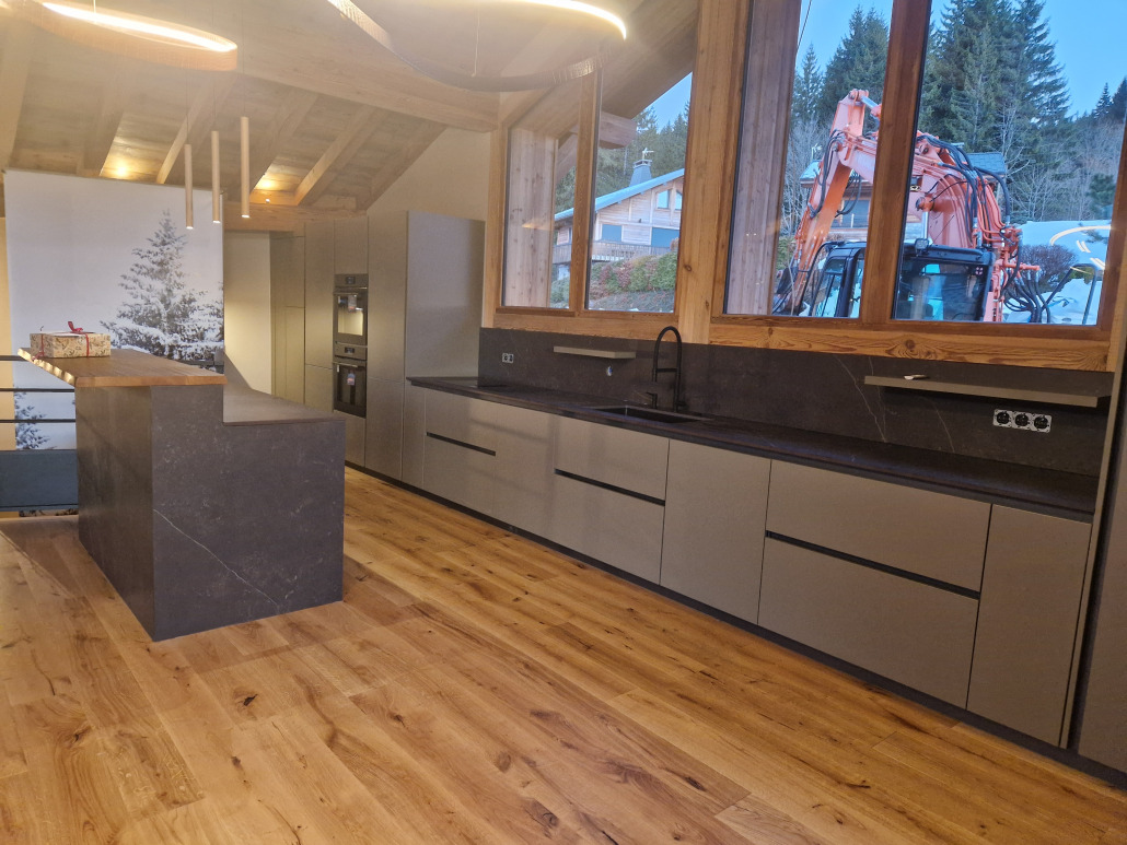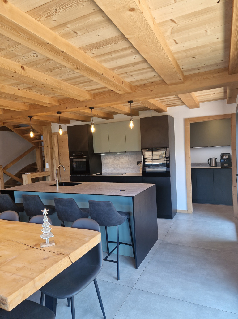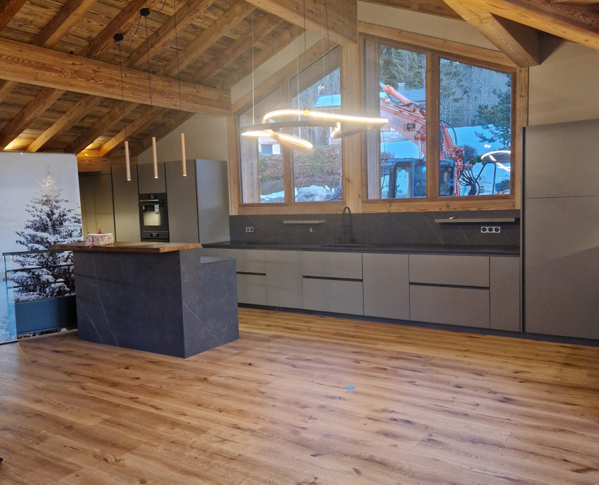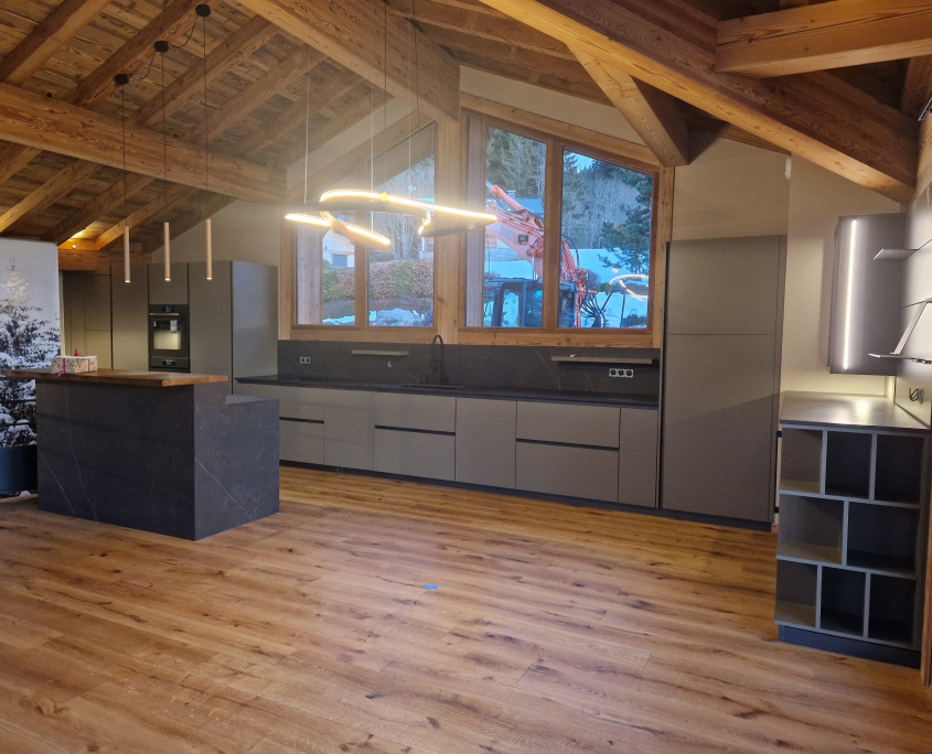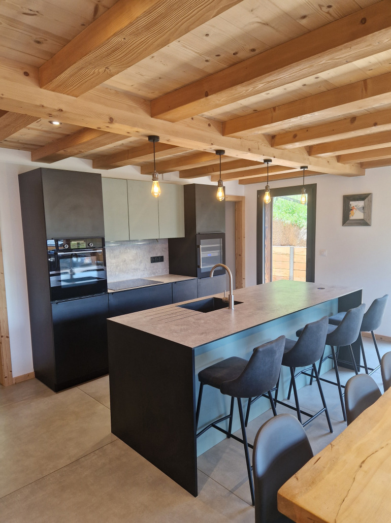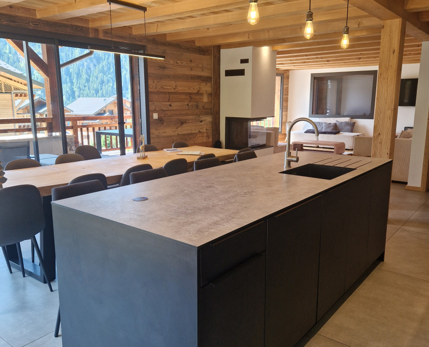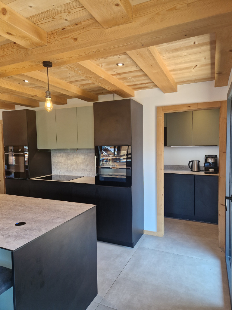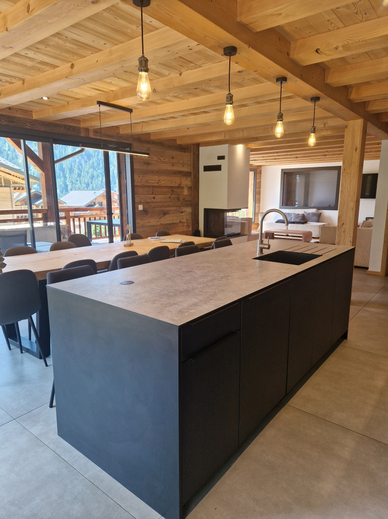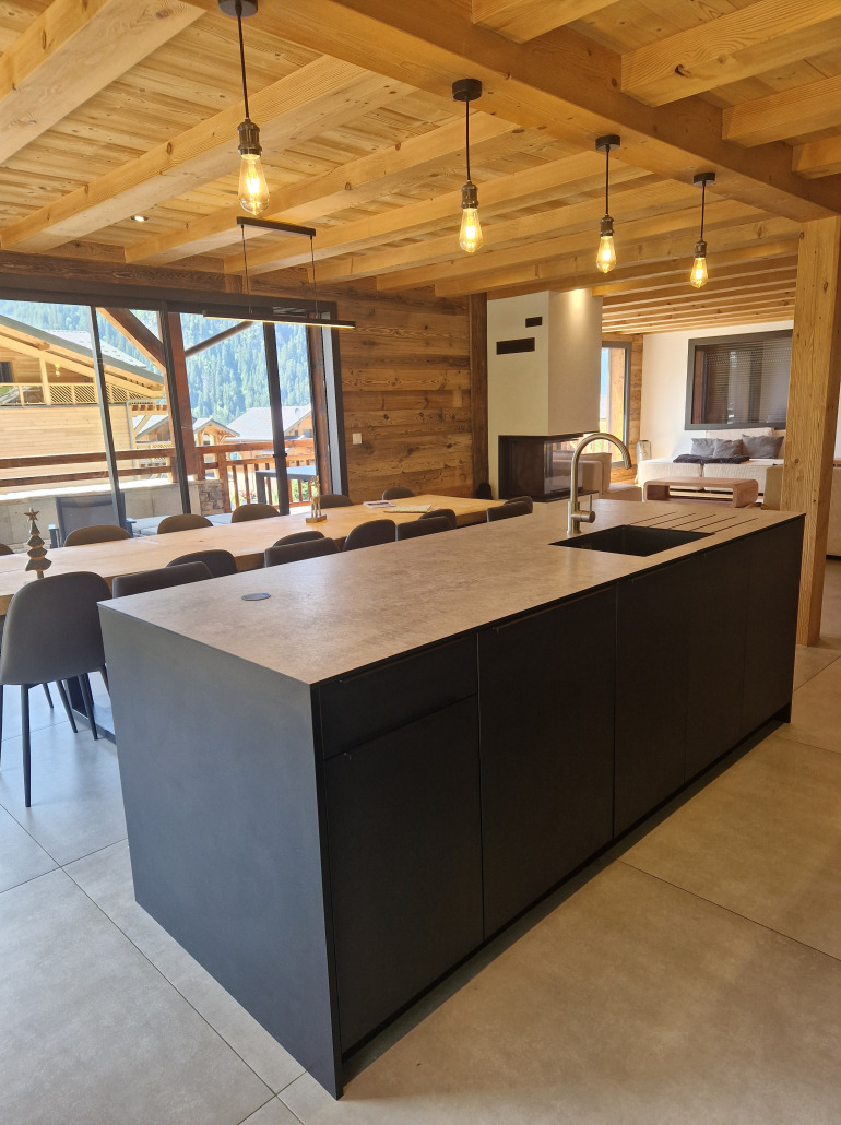 Une cuisine grand format pensée pour conjuguer design contemporain et esprit chalet, au cœur de volumes spectaculaires. Les façades laquées sur mesure, sans poignées, offrent une lecture fluide et élégante, en dialogue avec la chaleur du bois.
