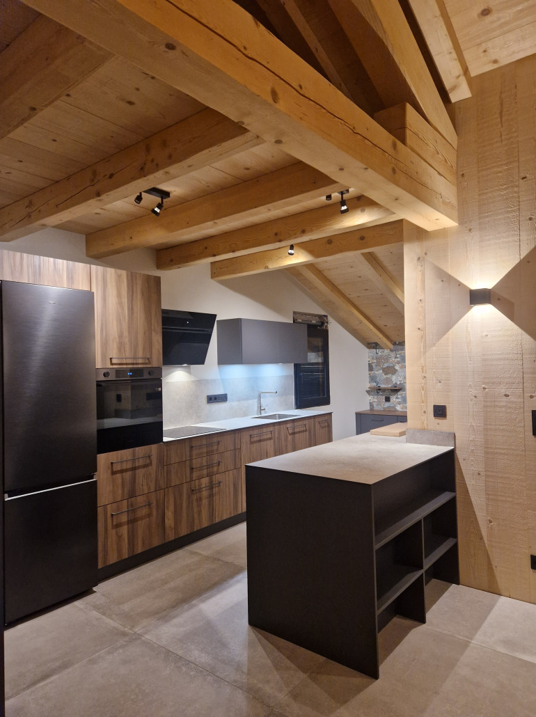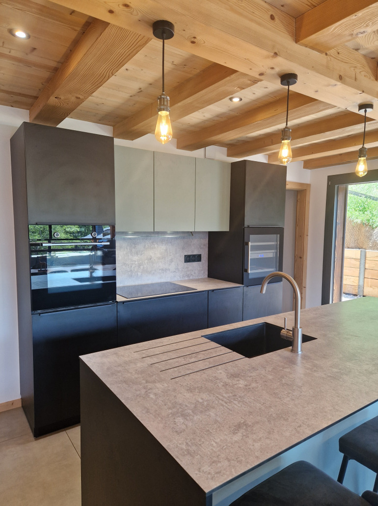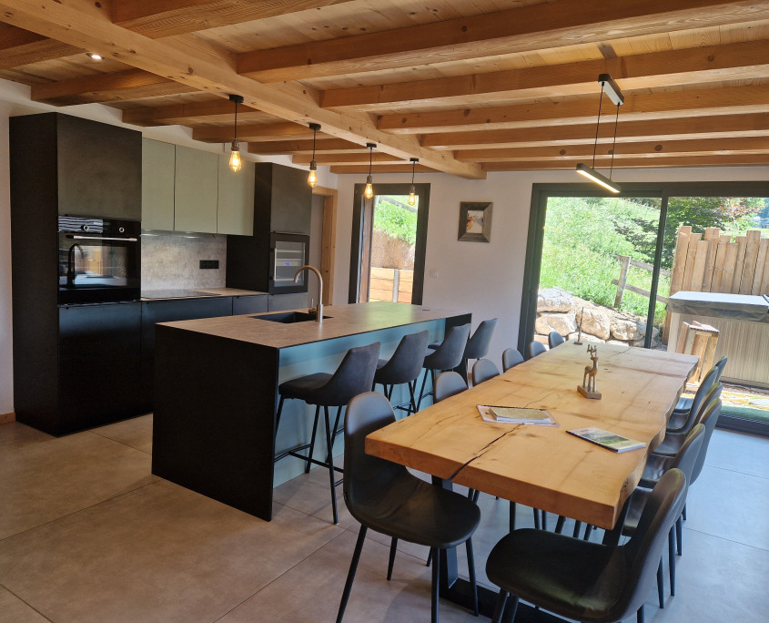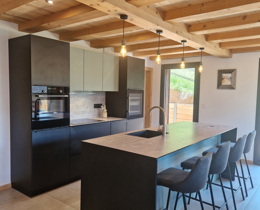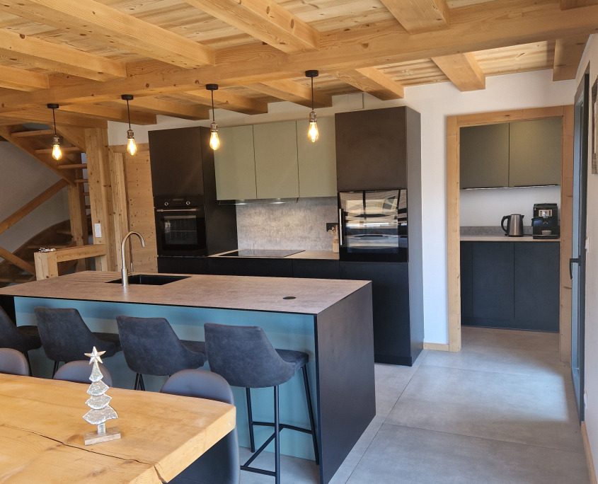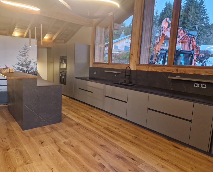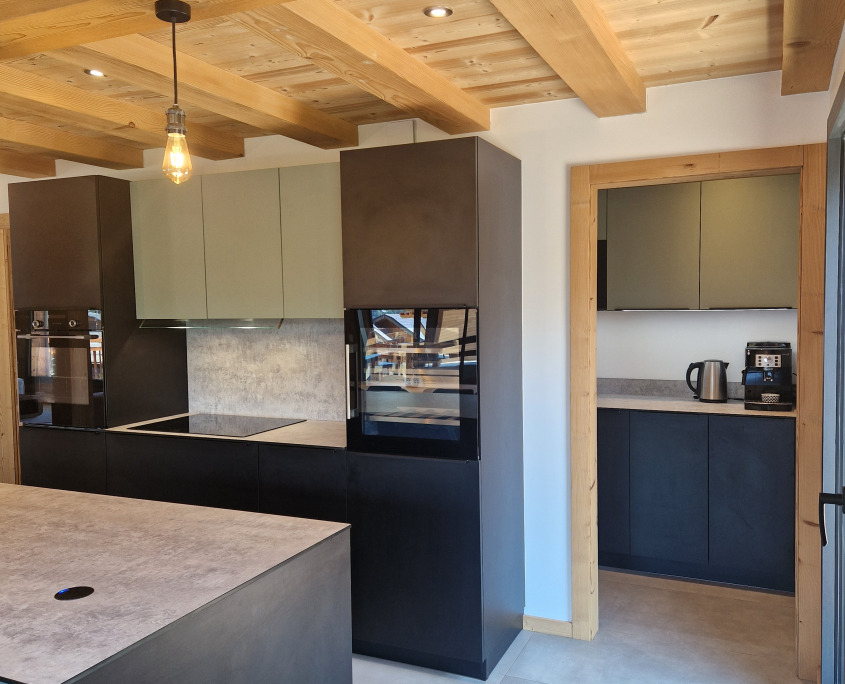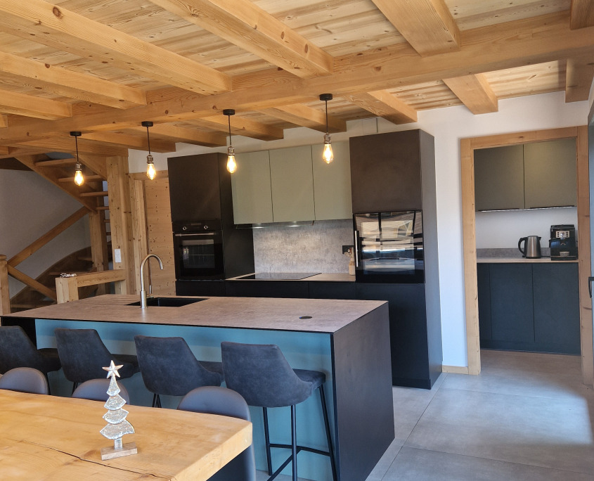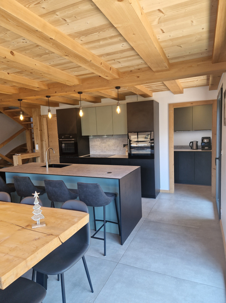 Une cuisine grand format pensée pour conjuguer design contemporain et esprit chalet, au cœur de volumes spectaculaires. Les façades laquées sur mesure, sans poignées, offrent une lecture fluide et élégante, en dialogue avec la chaleur du bois.