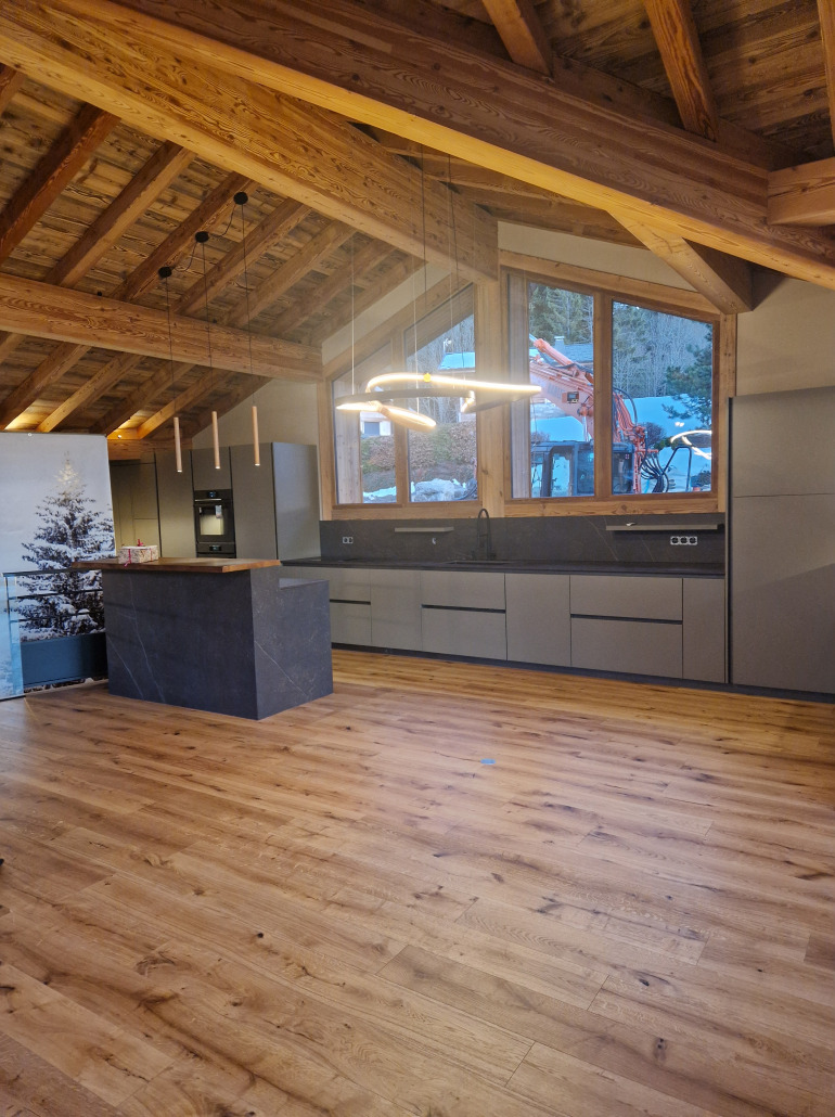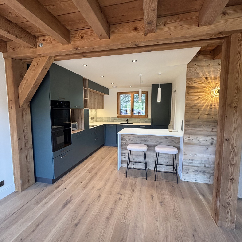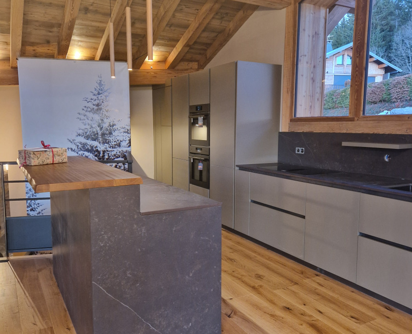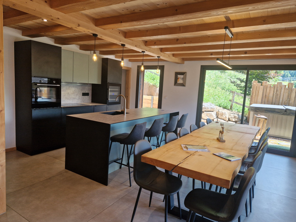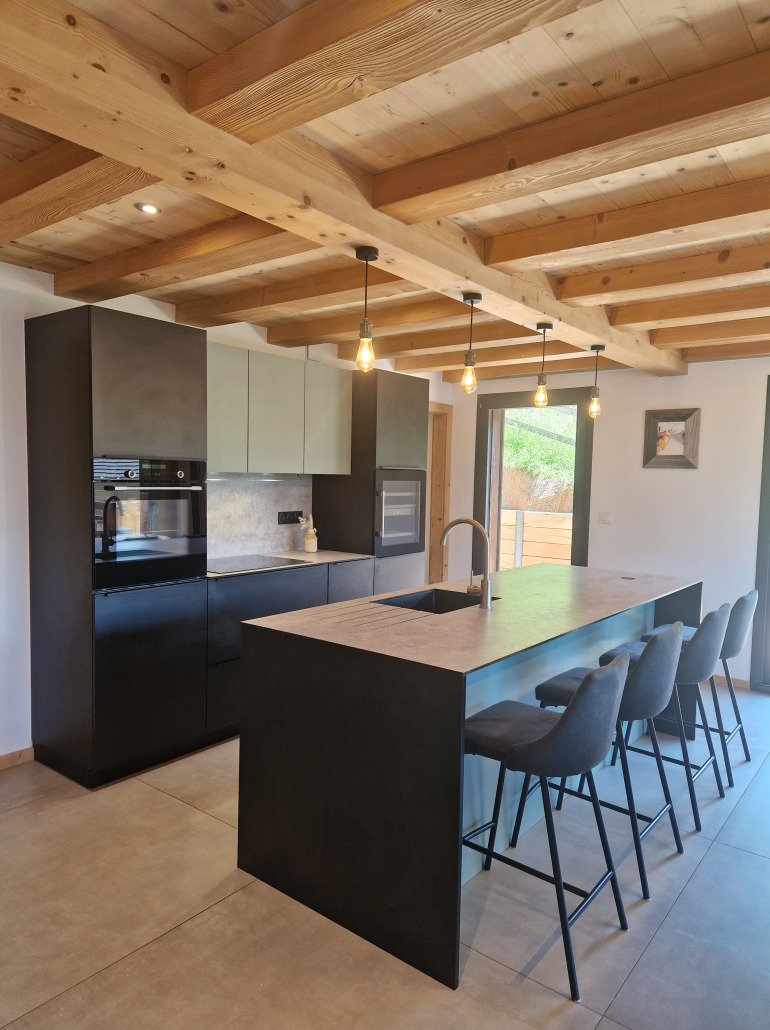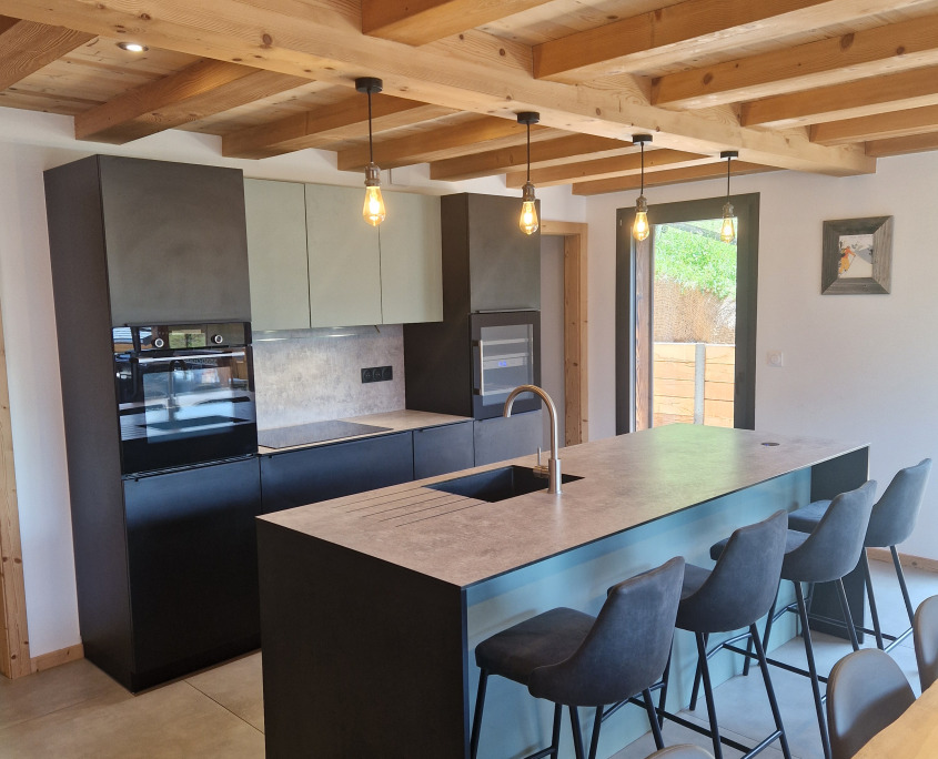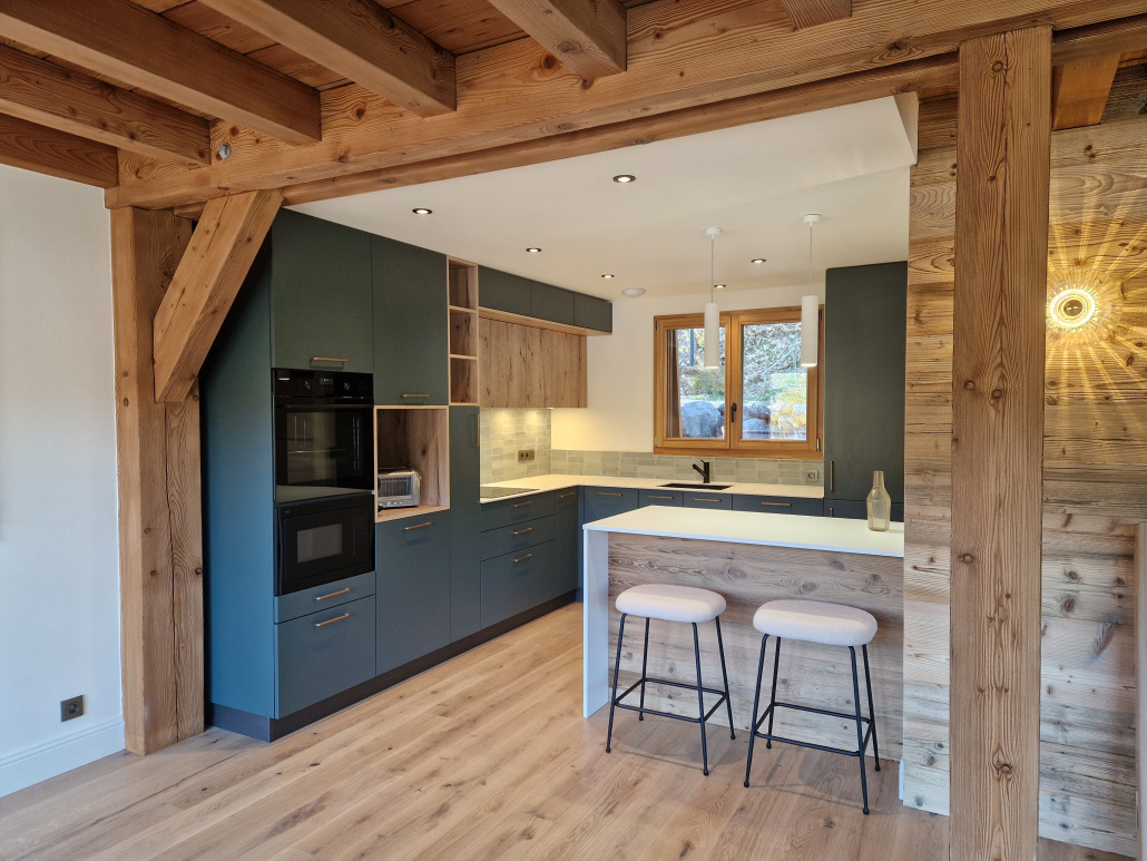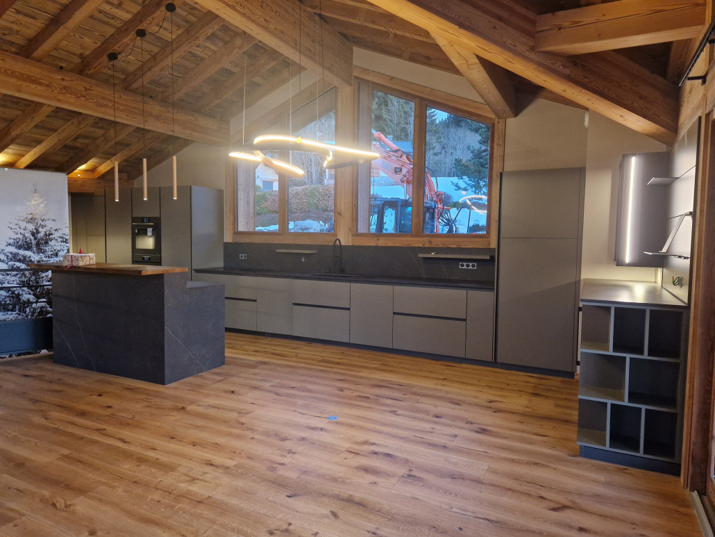 Une cuisine grand format pensée pour conjuguer design contemporain et esprit chalet, au cœur de volumes spectaculaires. Les façades laquées sur mesure, sans poignées, offrent une lecture fluide et élégante, en dialogue avec la chaleur du bois.