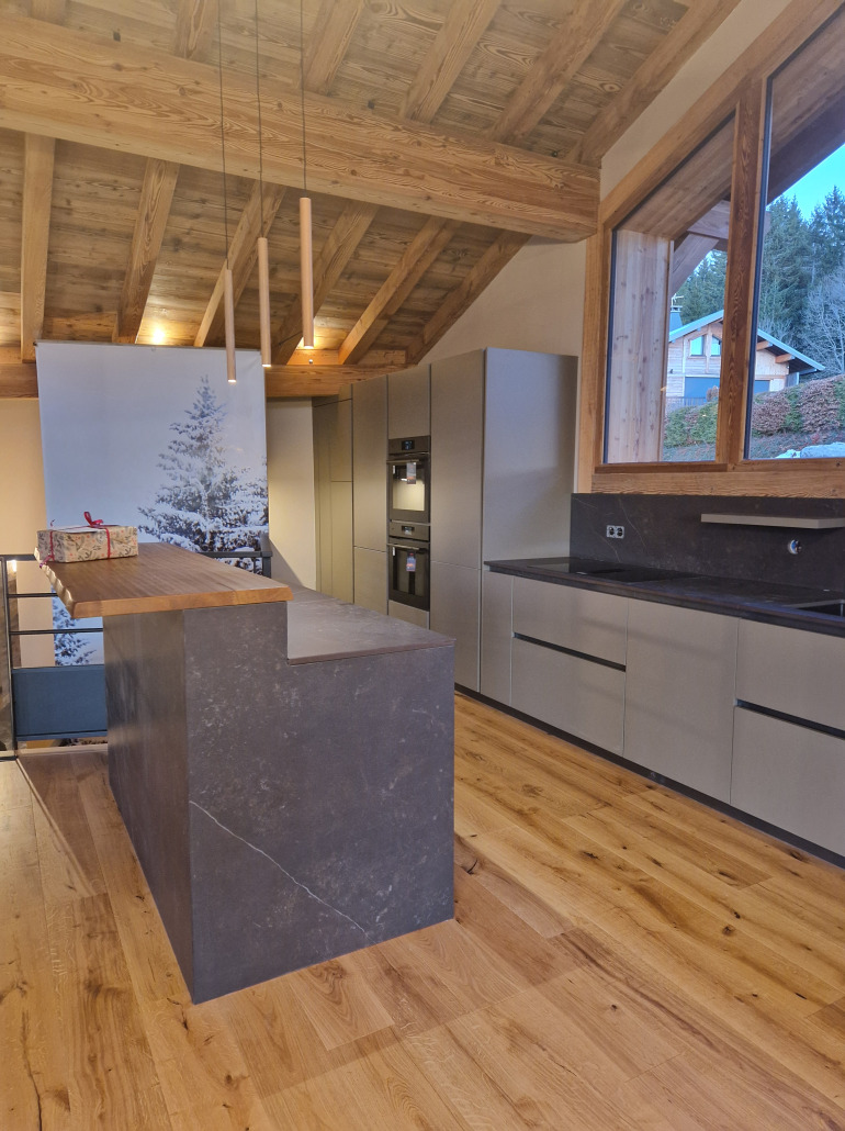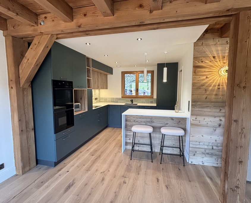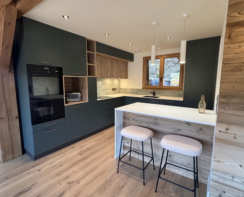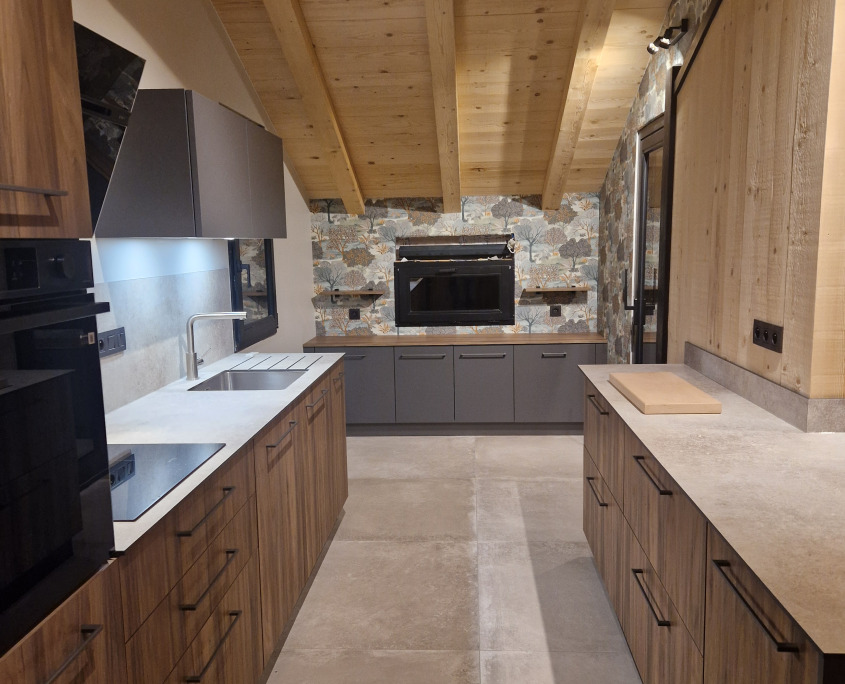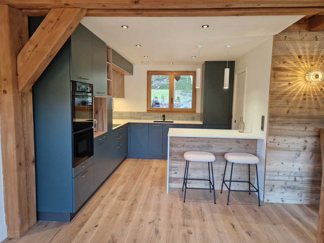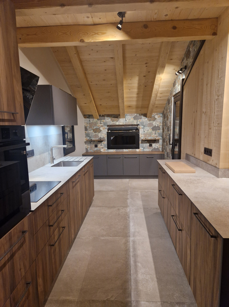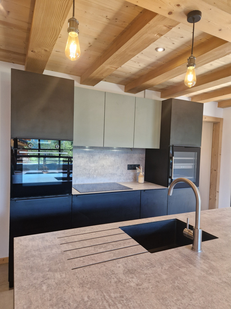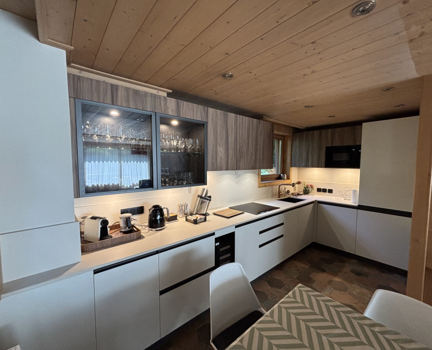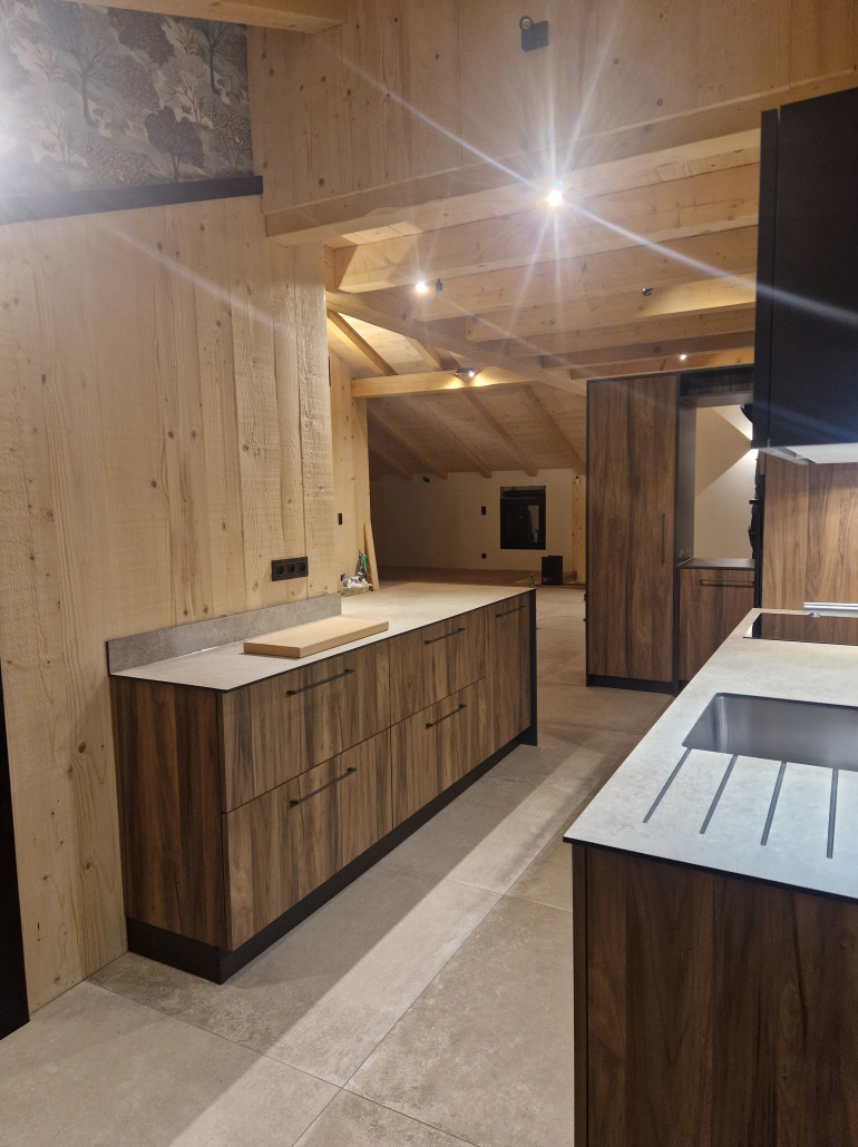 Une cuisine grand format pensée pour conjuguer design contemporain et esprit chalet, au cœur de volumes spectaculaires. Les façades laquées sur mesure, sans poignées, offrent une lecture fluide et élégante, en dialogue avec la chaleur du bois.