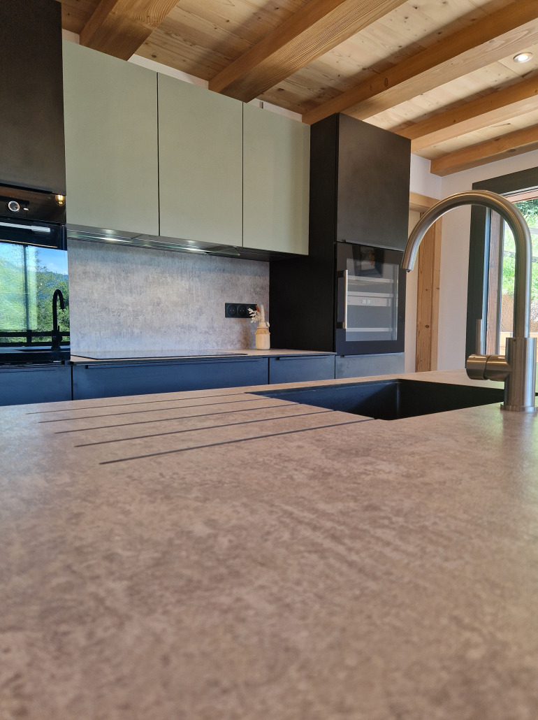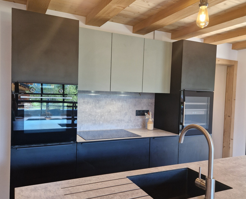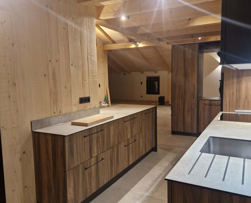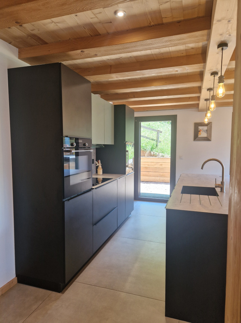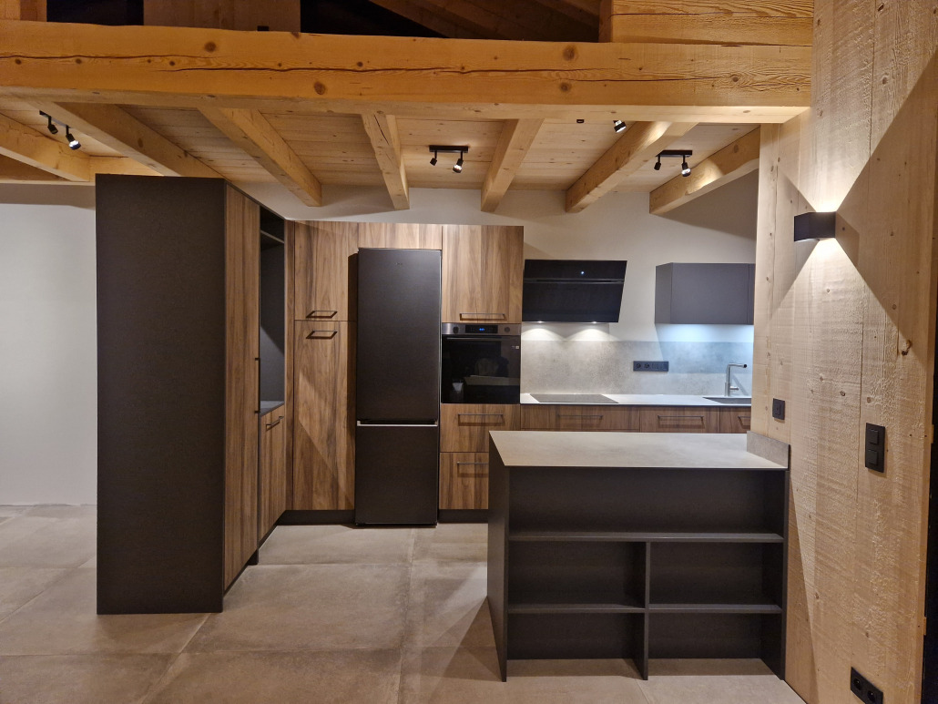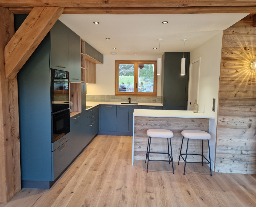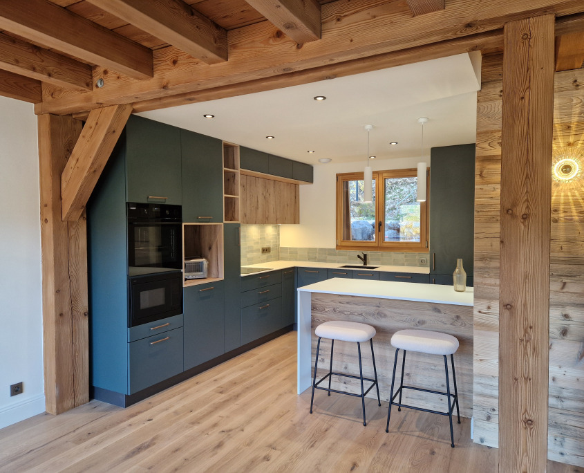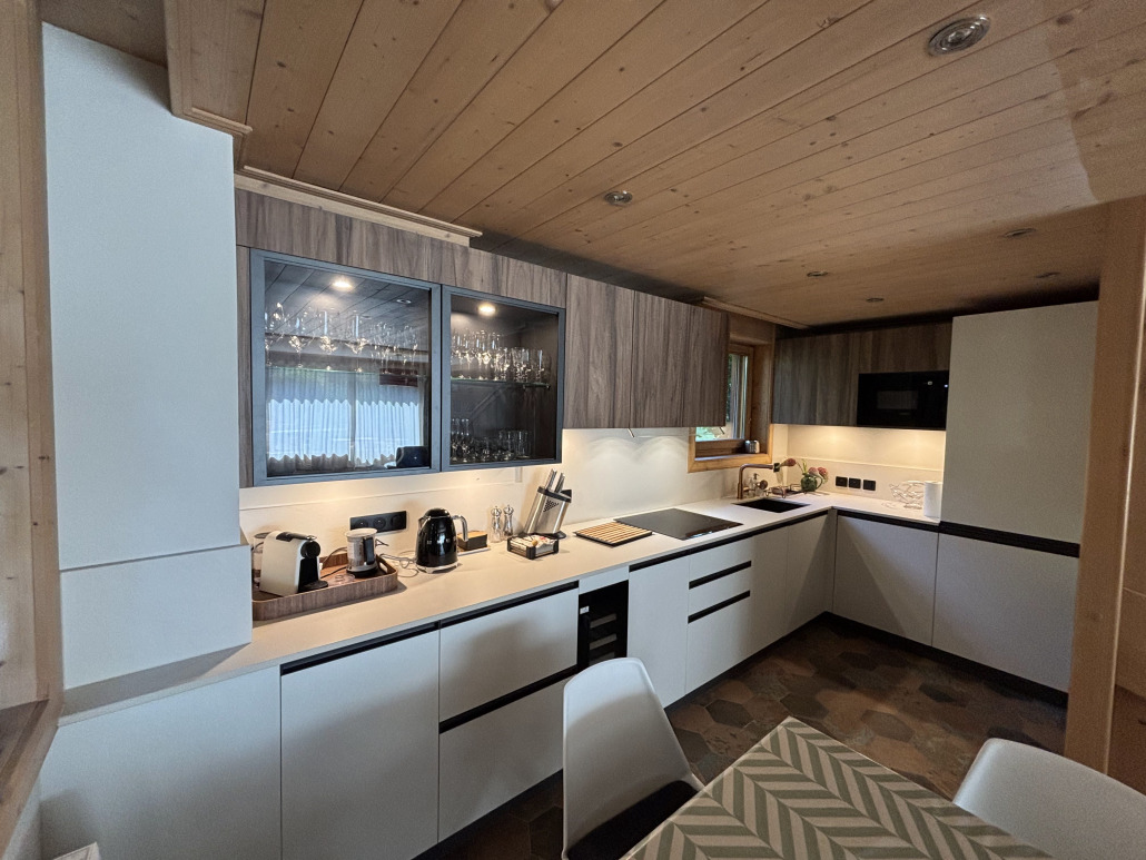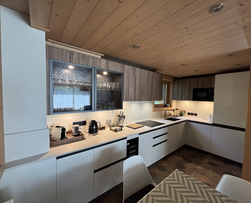 Une cuisine grand format pensée pour conjuguer design contemporain et esprit chalet, au cœur de volumes spectaculaires. Les façades laquées sur mesure, sans poignées, offrent une lecture fluide et élégante, en dialogue avec la chaleur du bois.