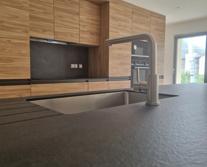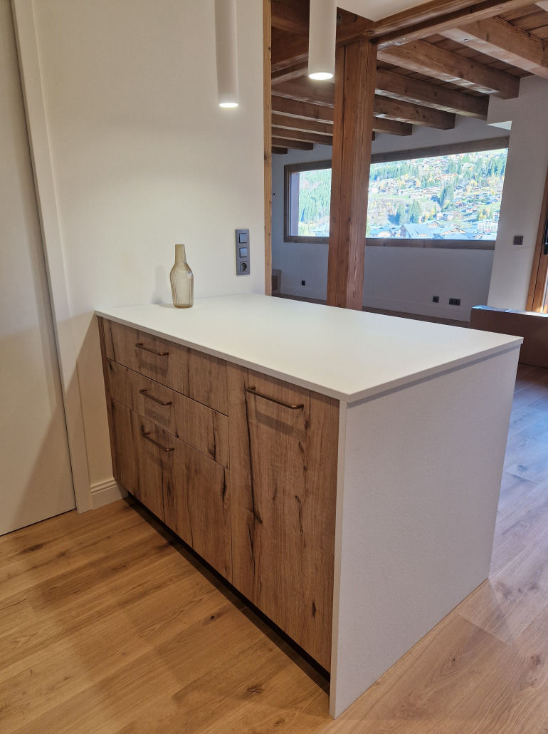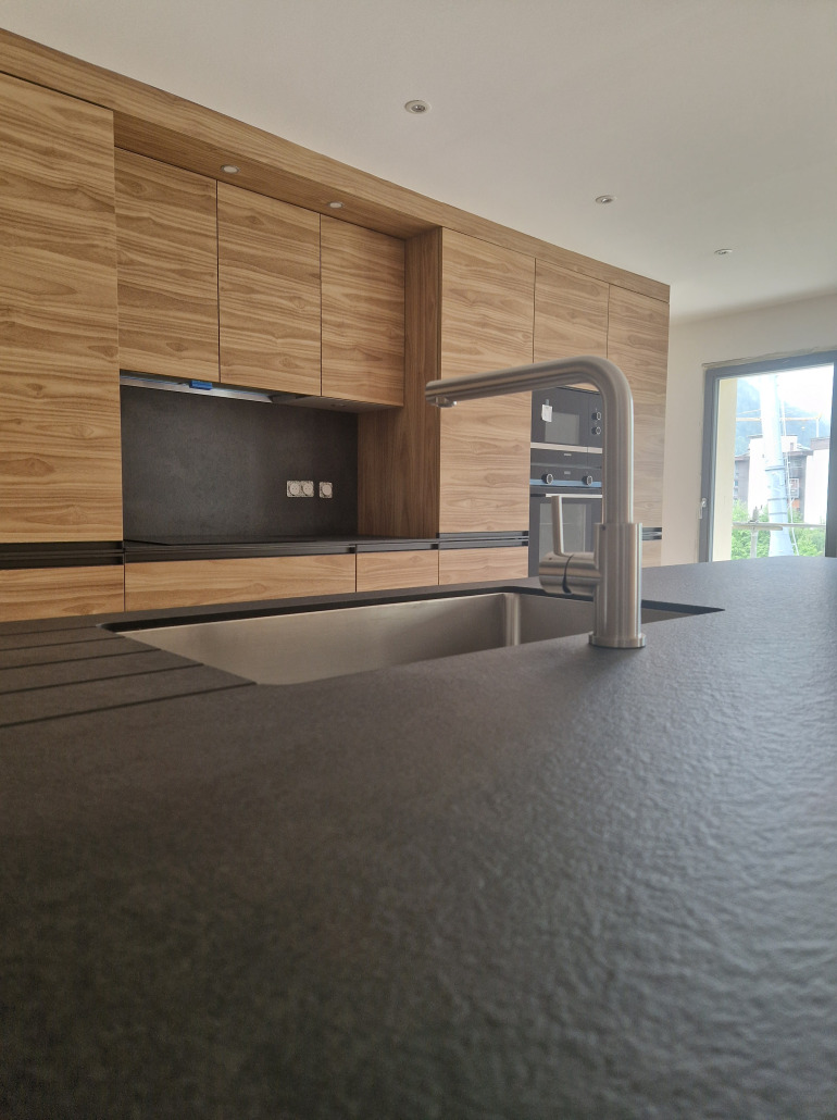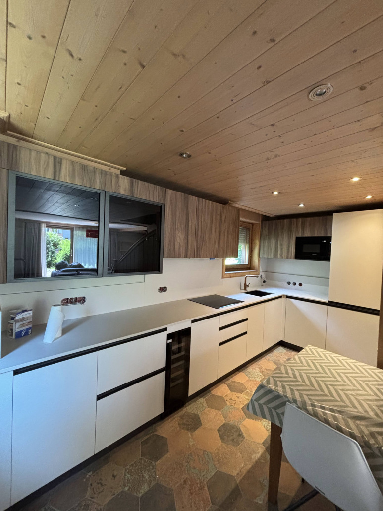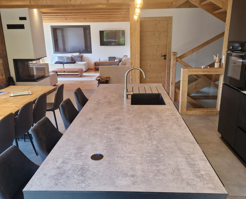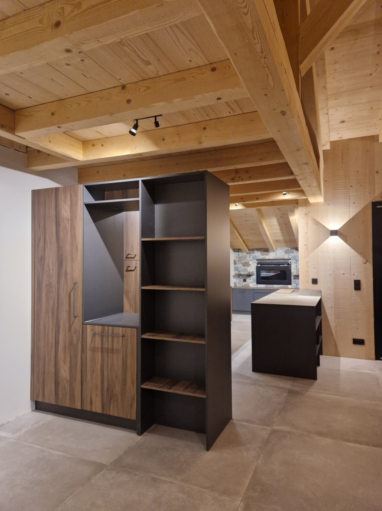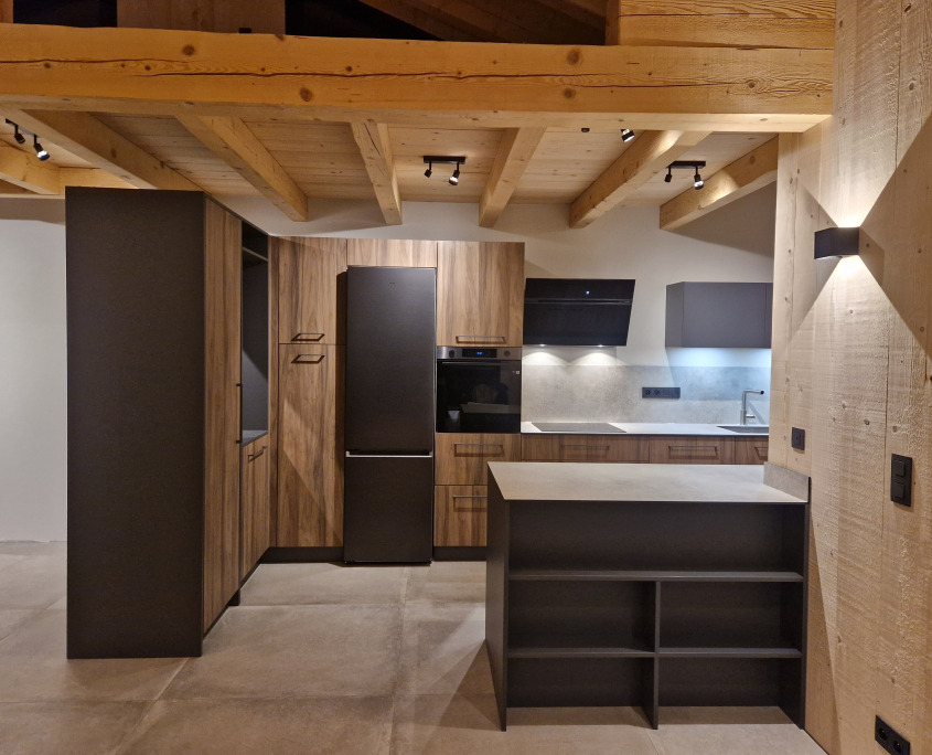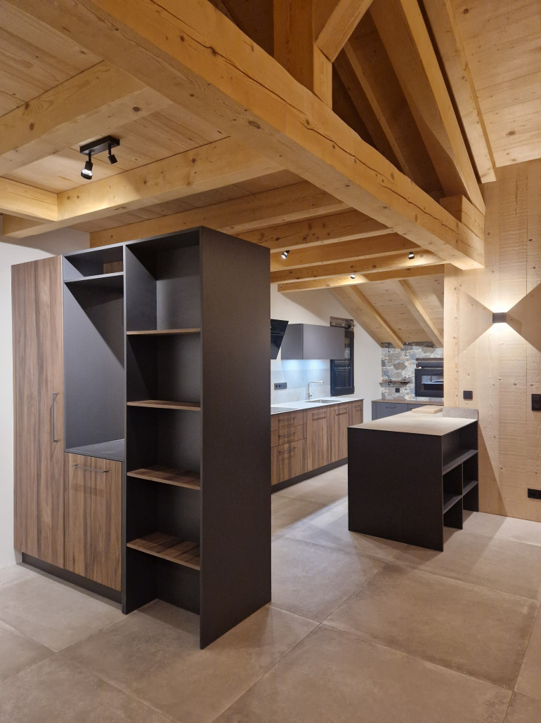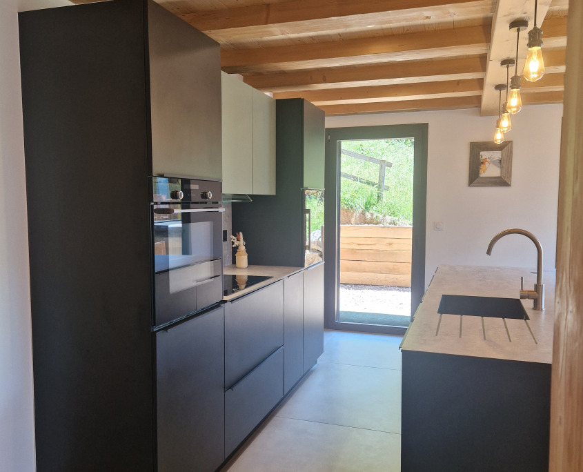 Une cuisine grand format pensée pour conjuguer design contemporain et esprit chalet, au cœur de volumes spectaculaires. Les façades laquées sur mesure, sans poignées, offrent une lecture fluide et élégante, en dialogue avec la chaleur du bois.