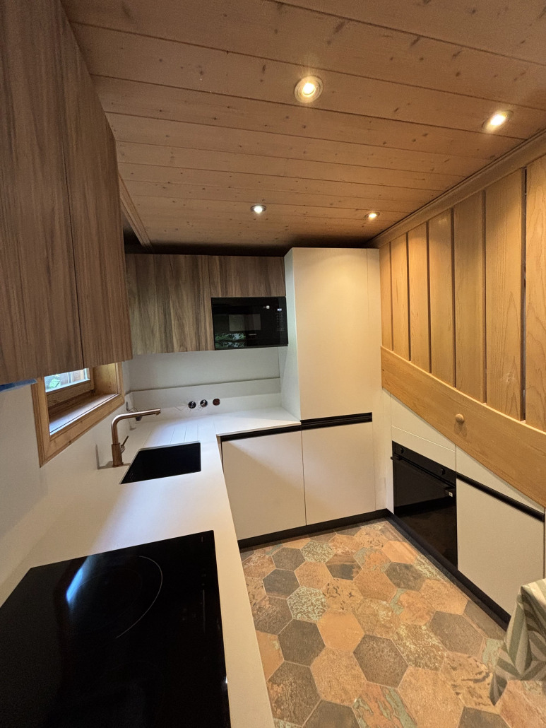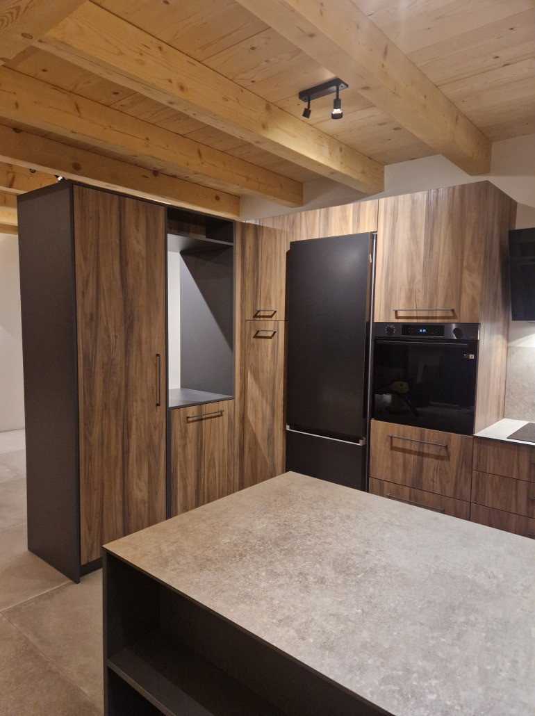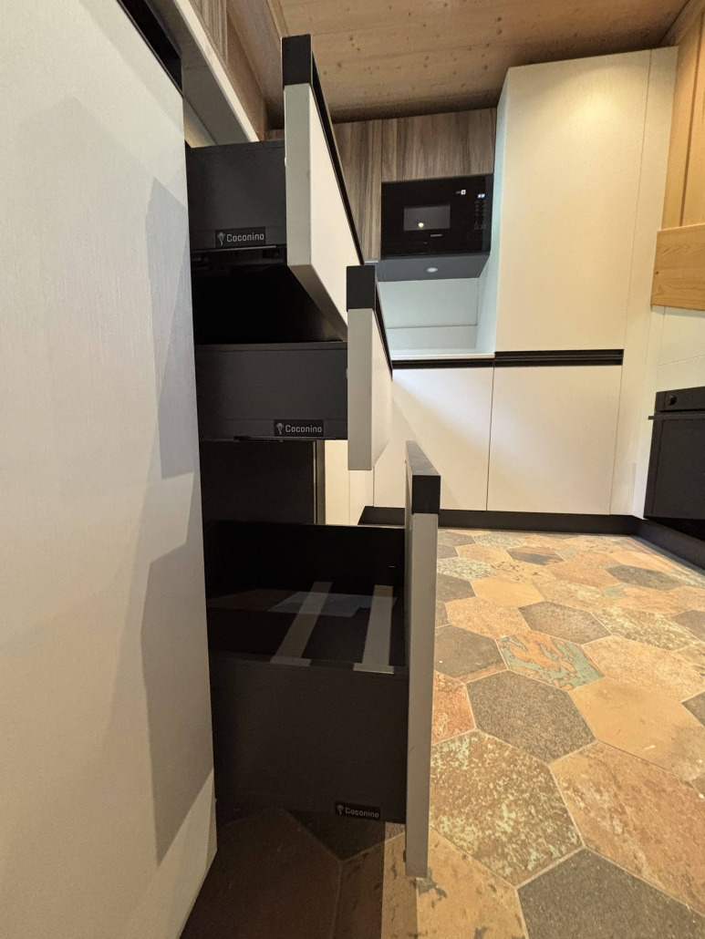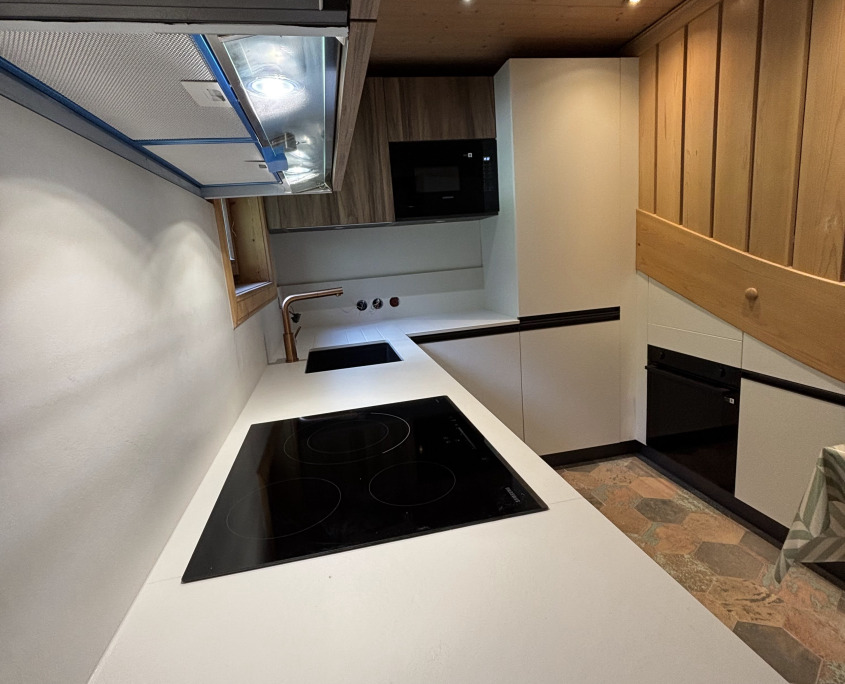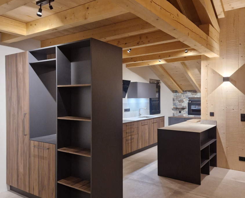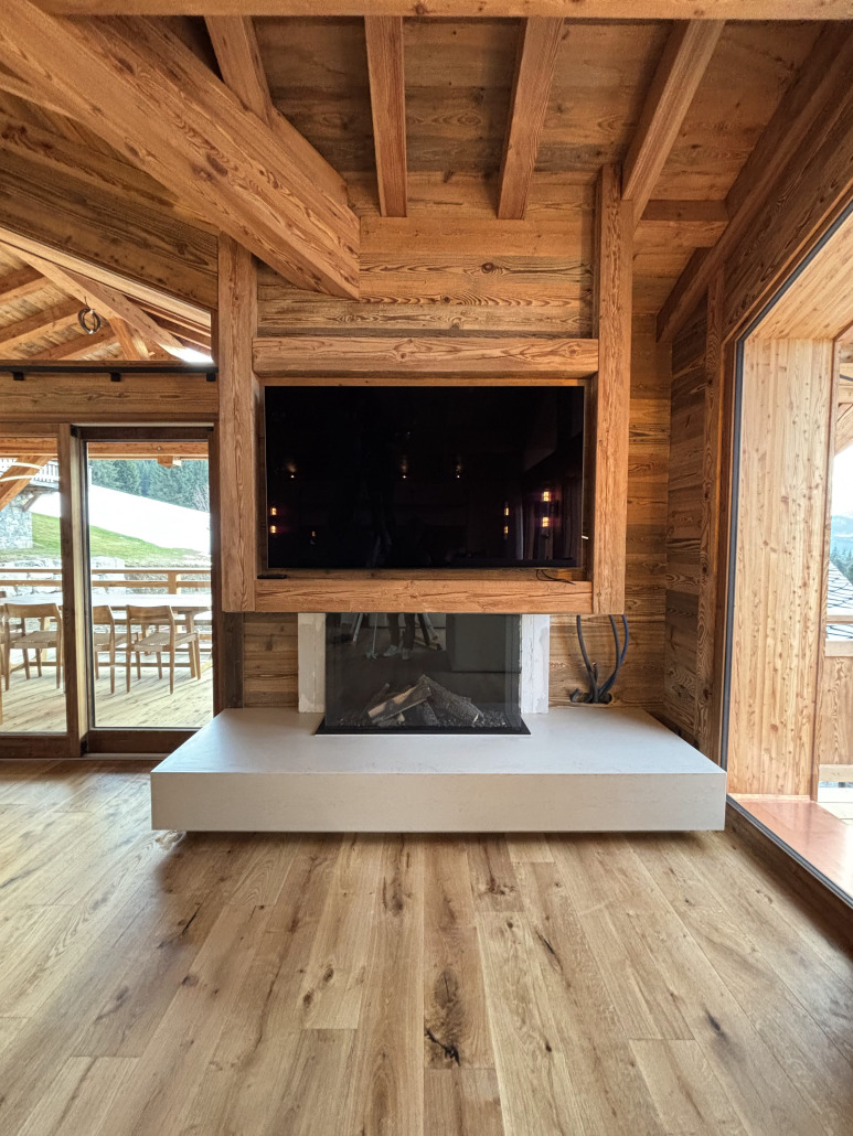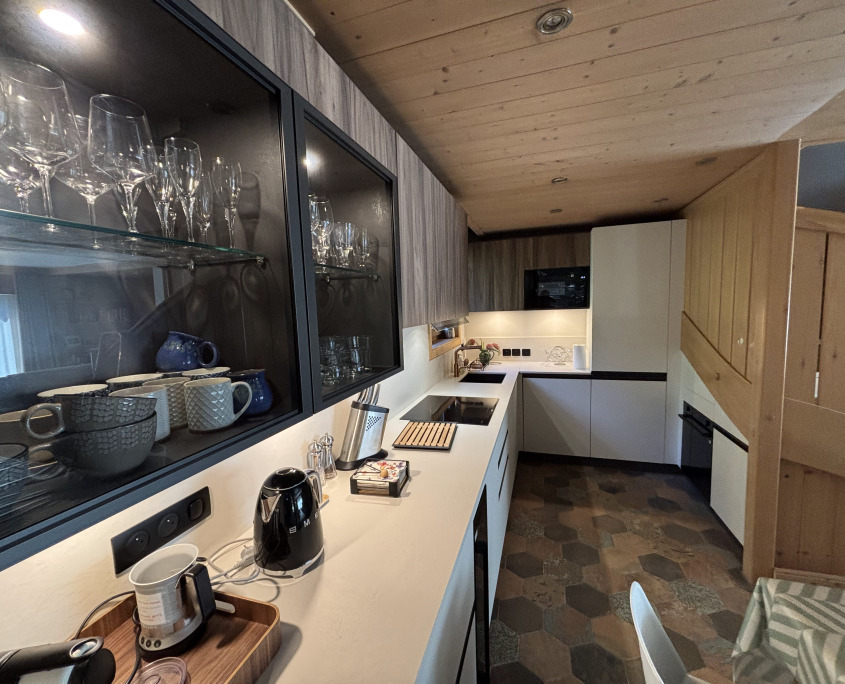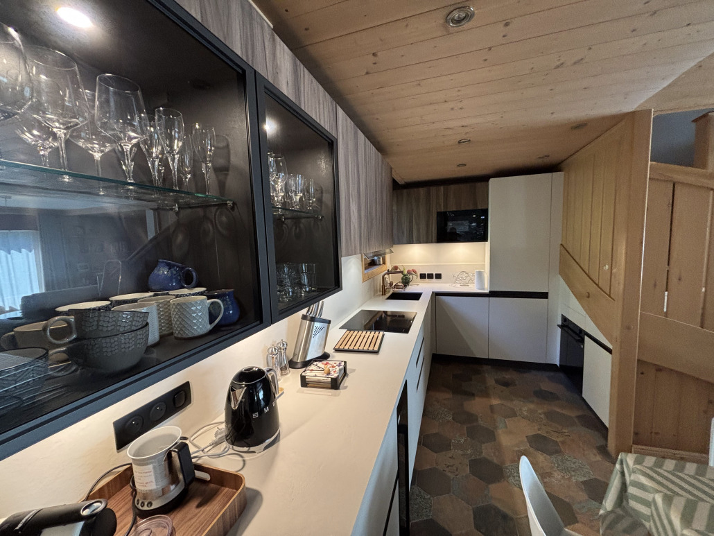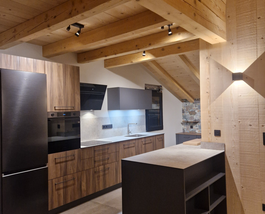 Une cuisine grand format pensée pour conjuguer design contemporain et esprit chalet, au cœur de volumes spectaculaires. Les façades laquées sur mesure, sans poignées, offrent une lecture fluide et élégante, en dialogue avec la chaleur du bois.