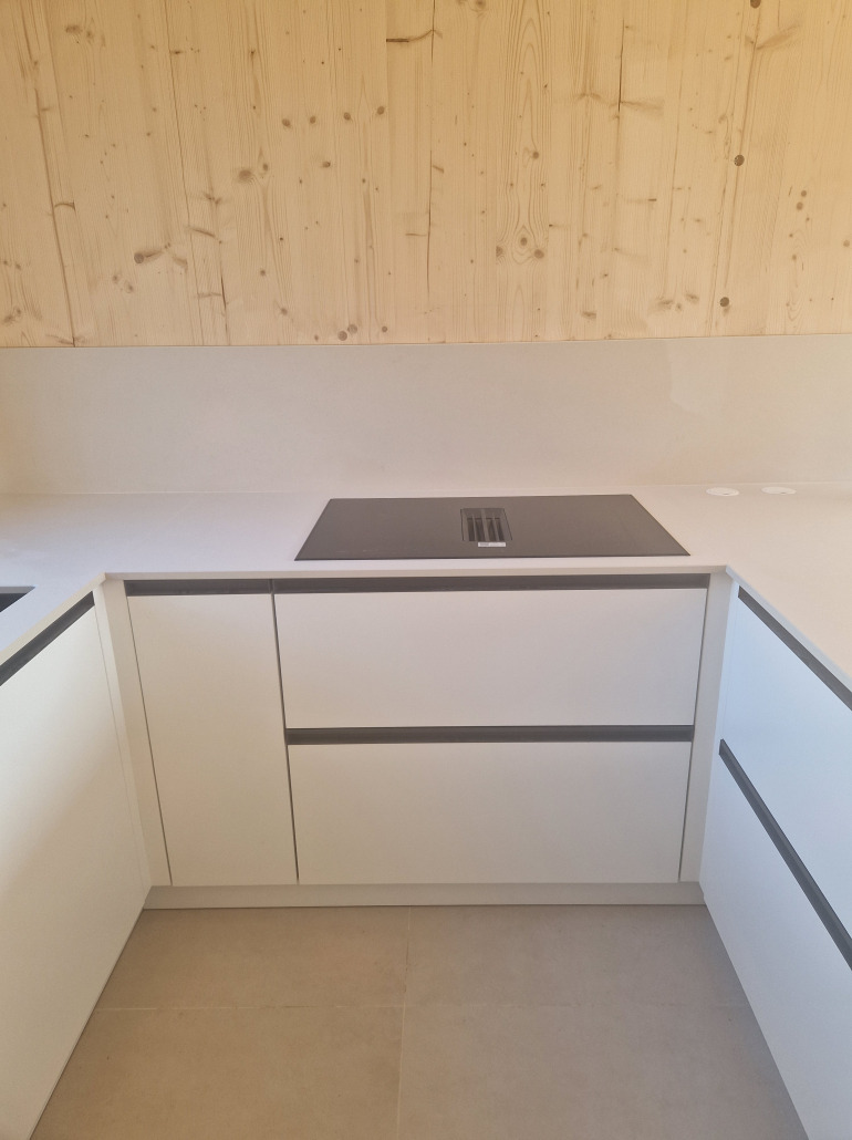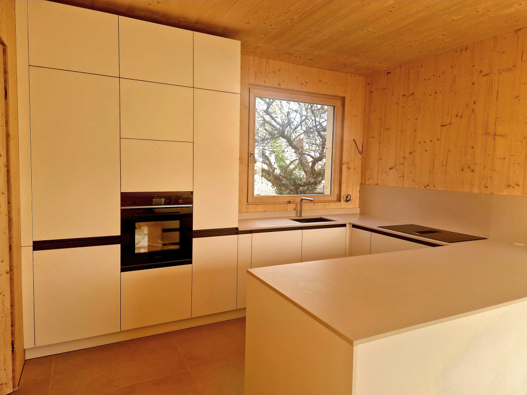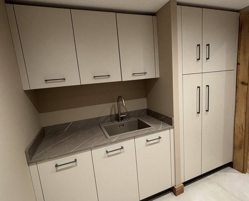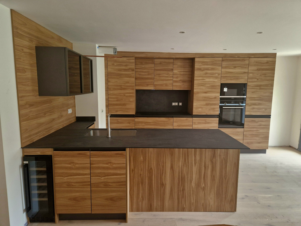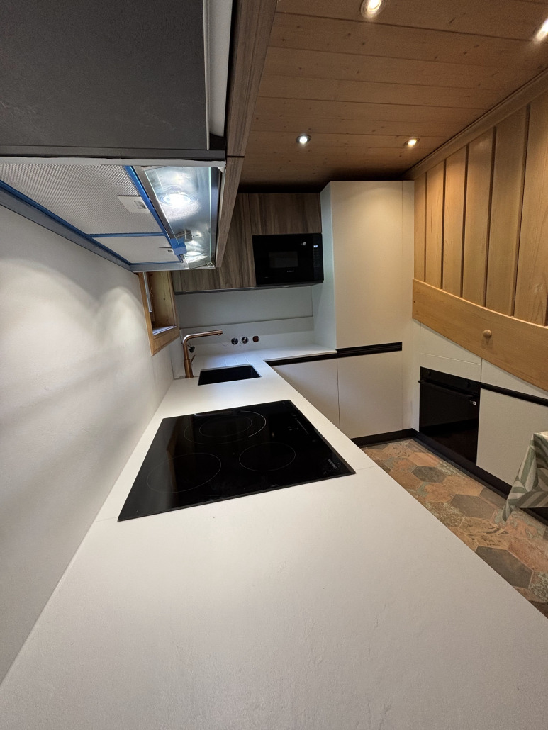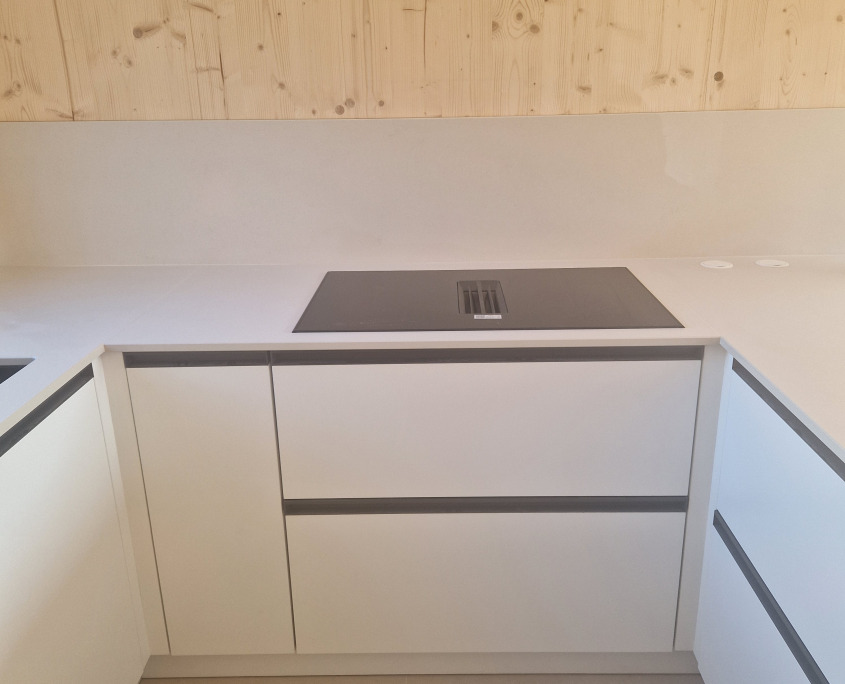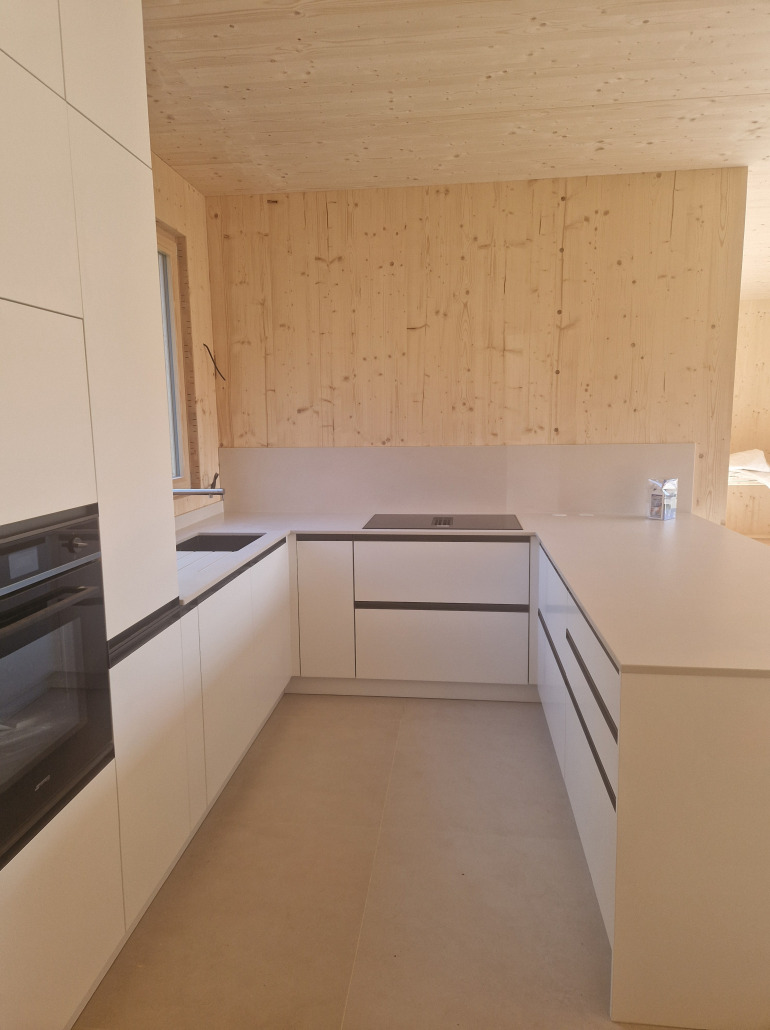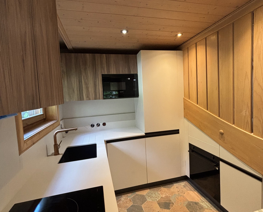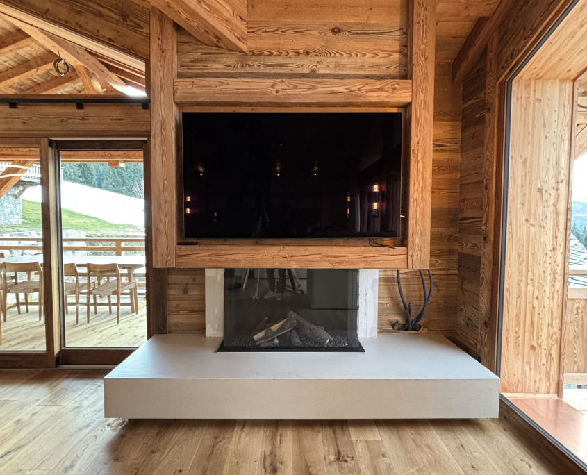 Une cuisine grand format pensée pour conjuguer design contemporain et esprit chalet, au cœur de volumes spectaculaires. Les façades laquées sur mesure, sans poignées, offrent une lecture fluide et élégante, en dialogue avec la chaleur du bois.