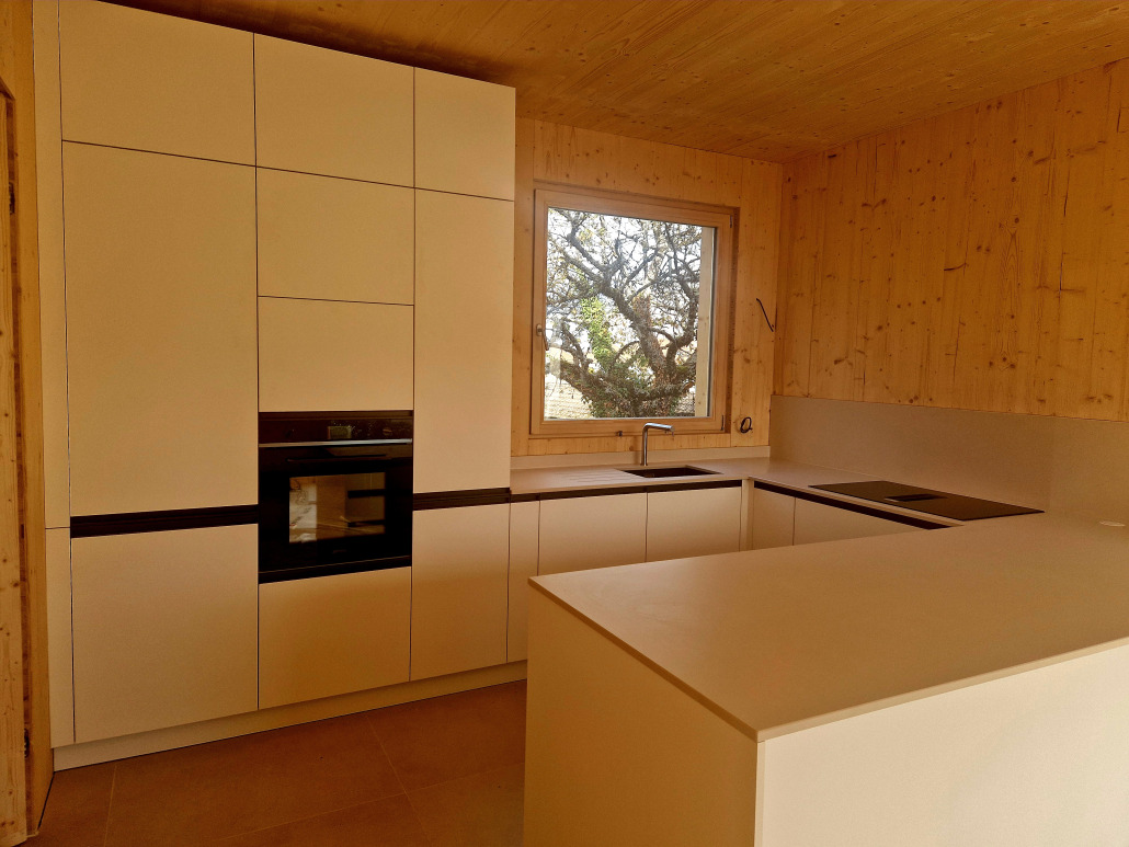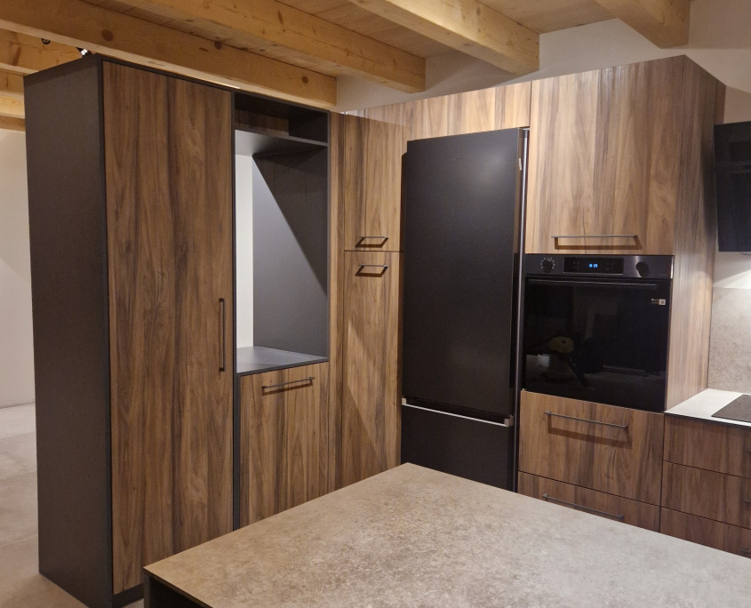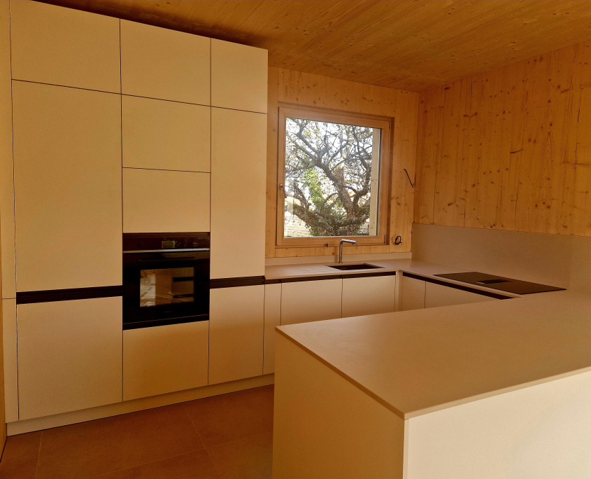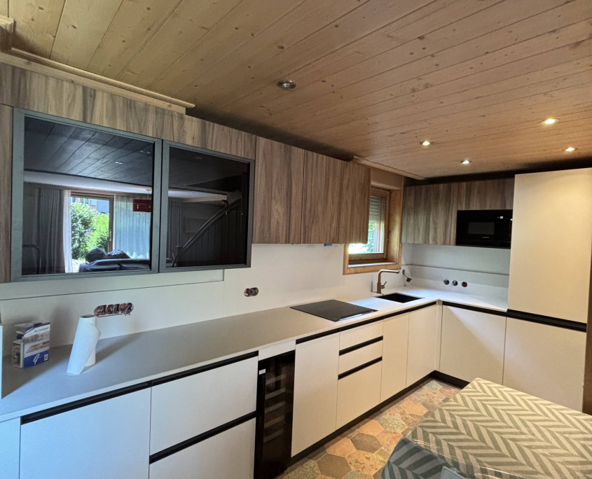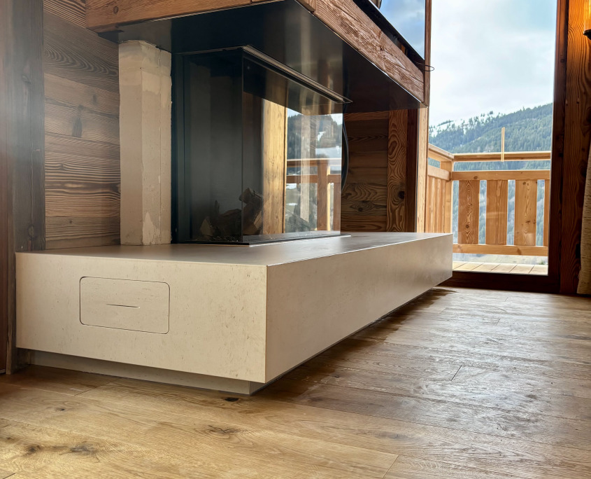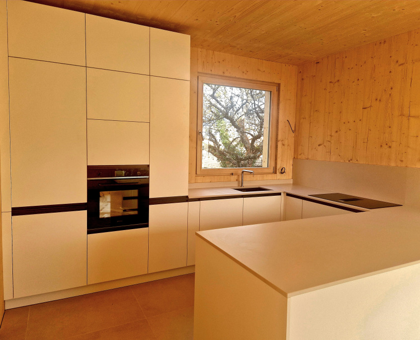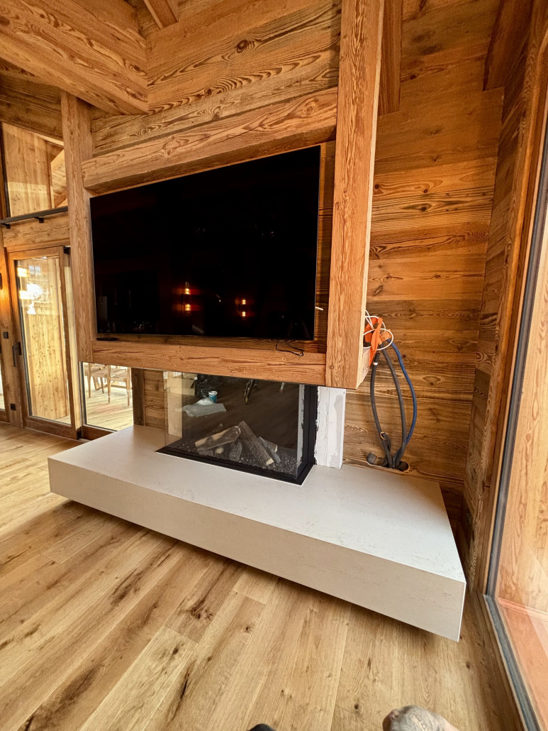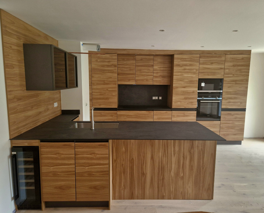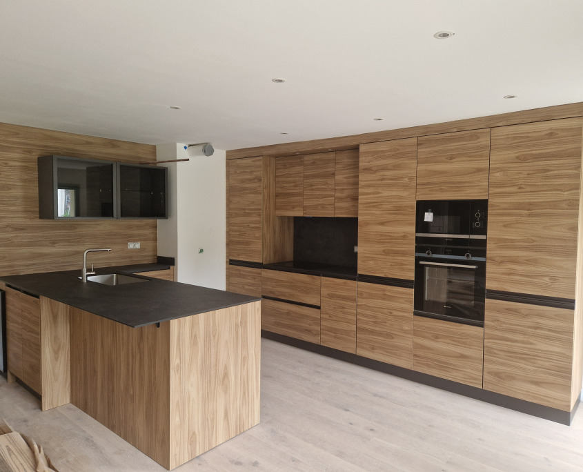 Une cuisine grand format pensée pour conjuguer design contemporain et esprit chalet, au cœur de volumes spectaculaires. Les façades laquées sur mesure, sans poignées, offrent une lecture fluide et élégante, en dialogue avec la chaleur du bois.