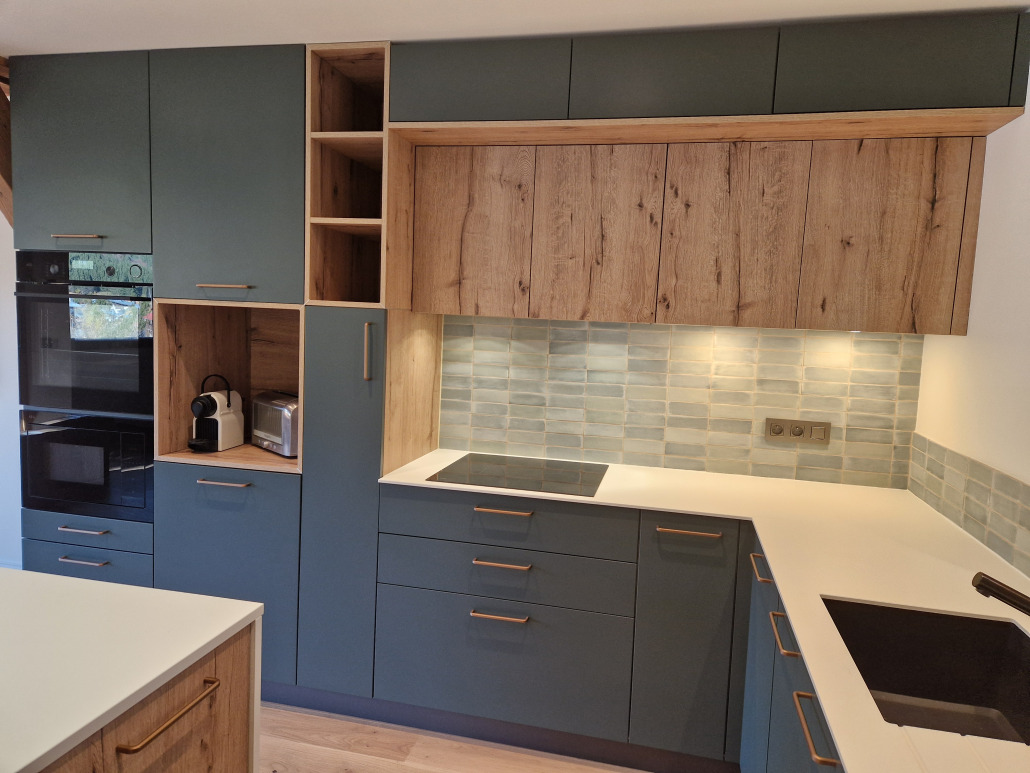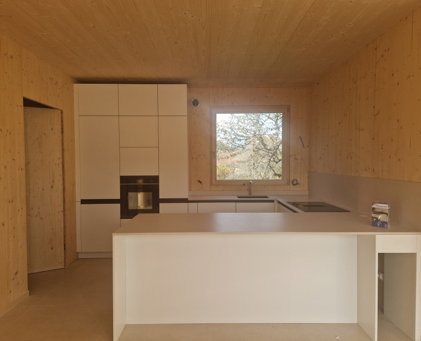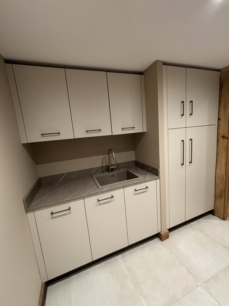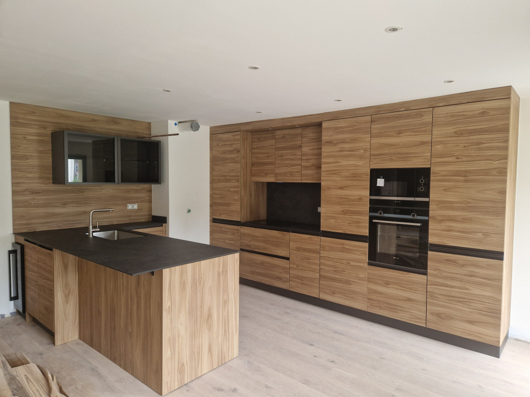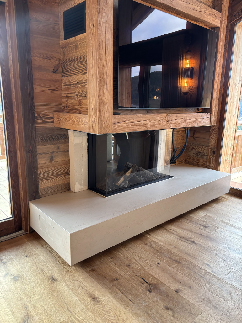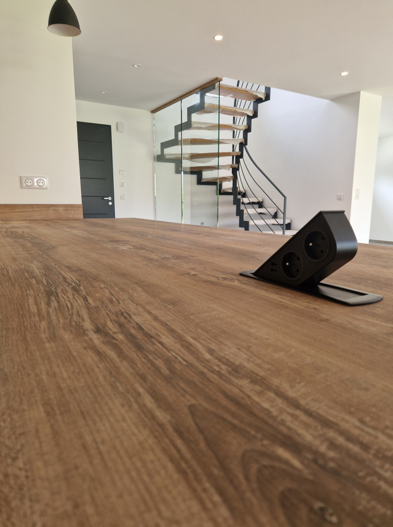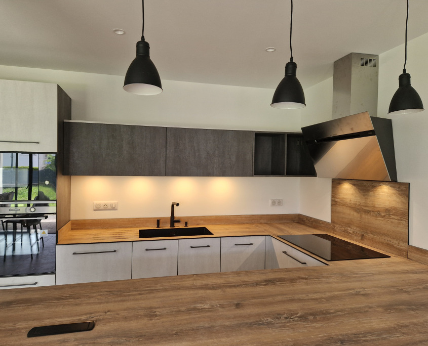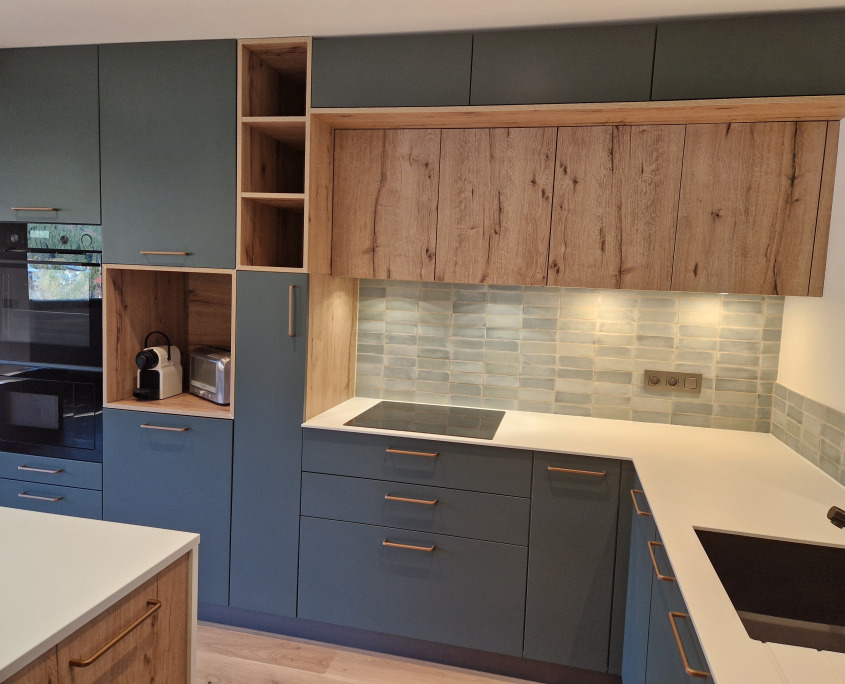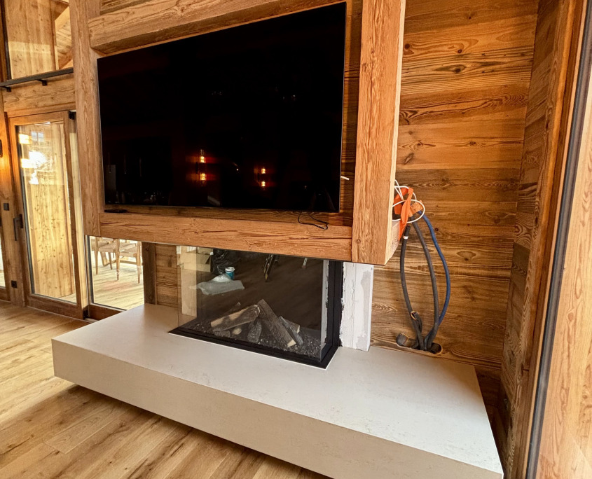 Une cuisine grand format pensée pour conjuguer design contemporain et esprit chalet, au cœur de volumes spectaculaires. Les façades laquées sur mesure, sans poignées, offrent une lecture fluide et élégante, en dialogue avec la chaleur du bois.
