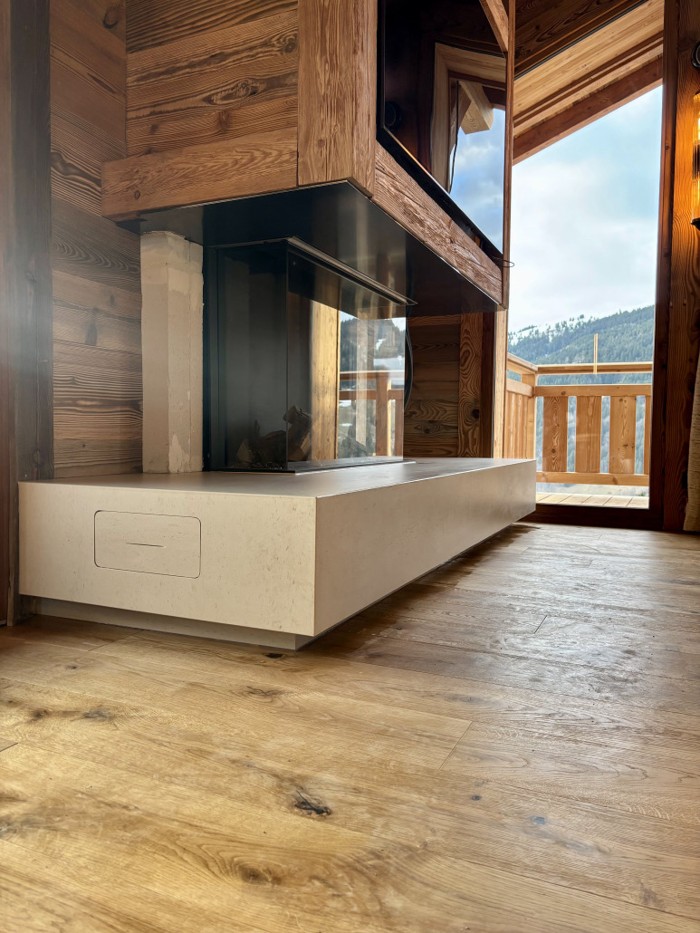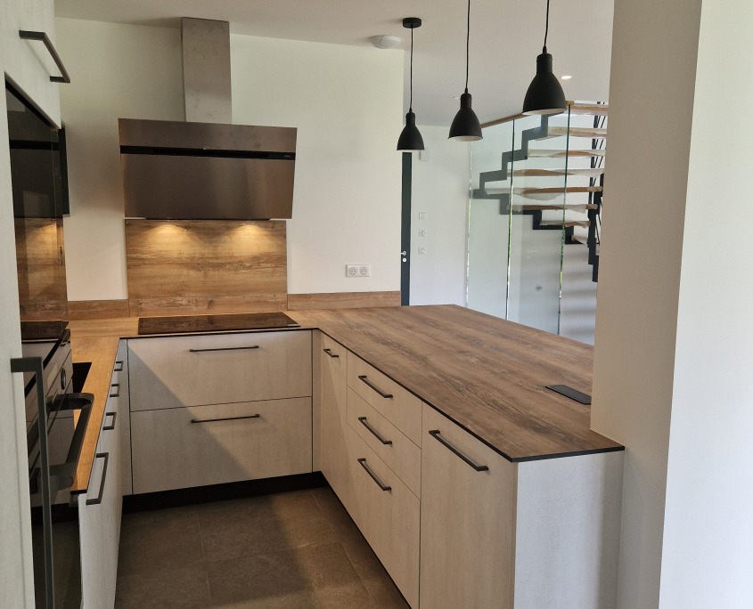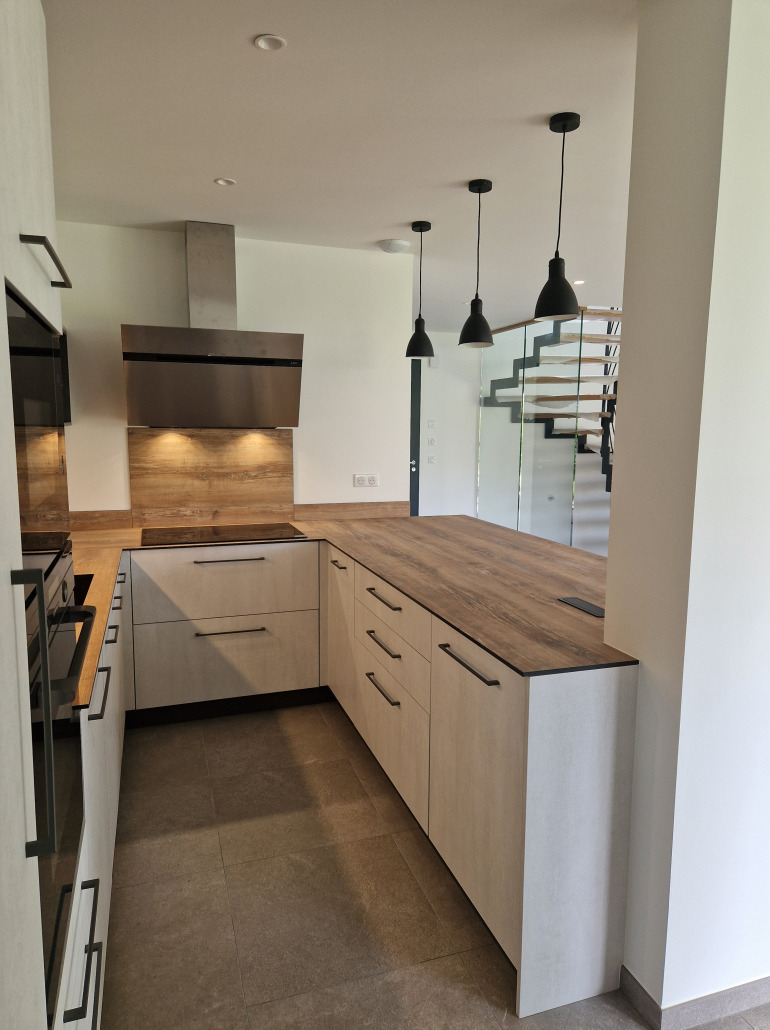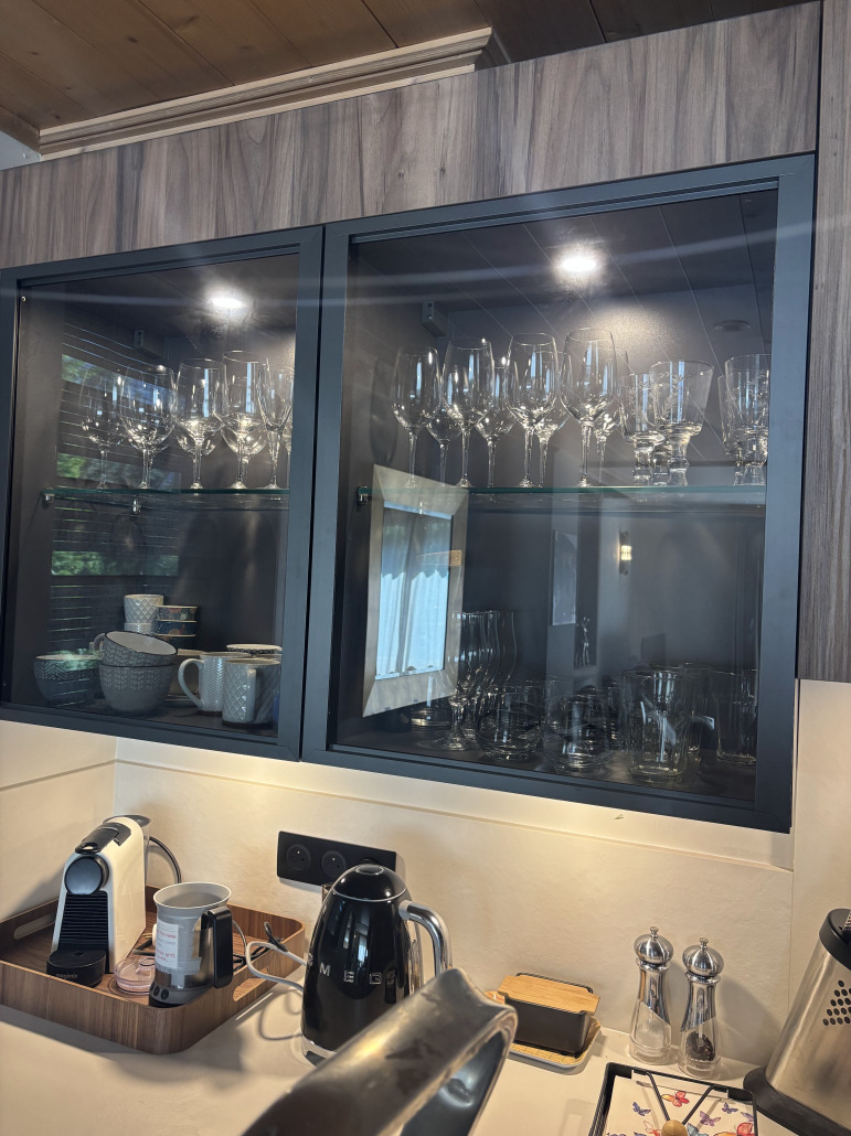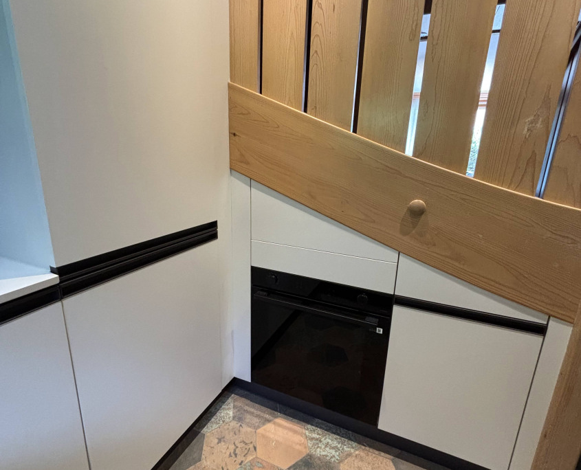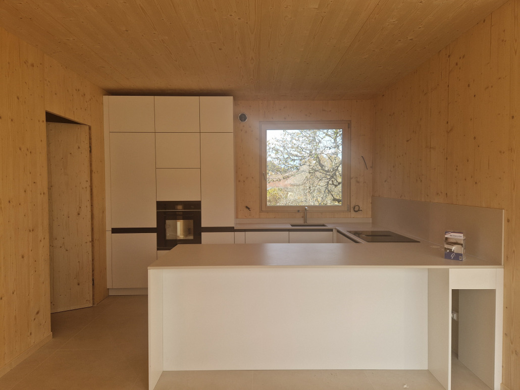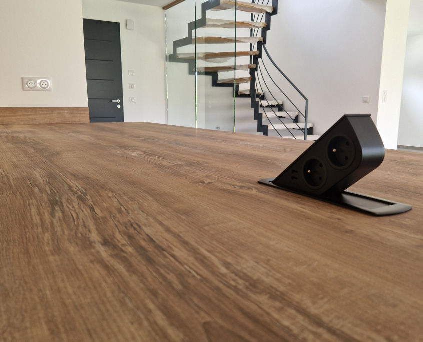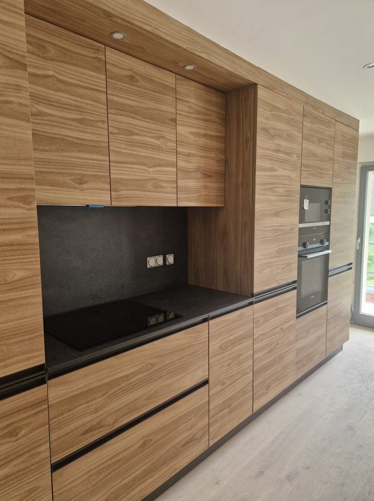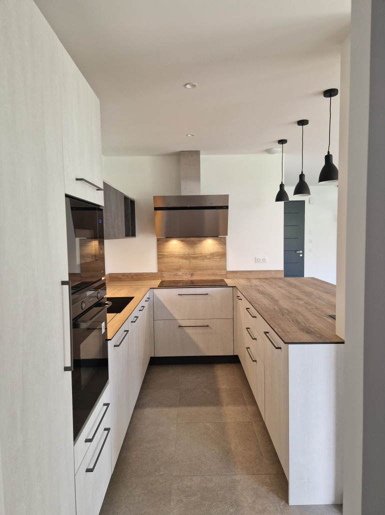 Une cuisine grand format pensée pour conjuguer design contemporain et esprit chalet, au cœur de volumes spectaculaires. Les façades laquées sur mesure, sans poignées, offrent une lecture fluide et élégante, en dialogue avec la chaleur du bois.