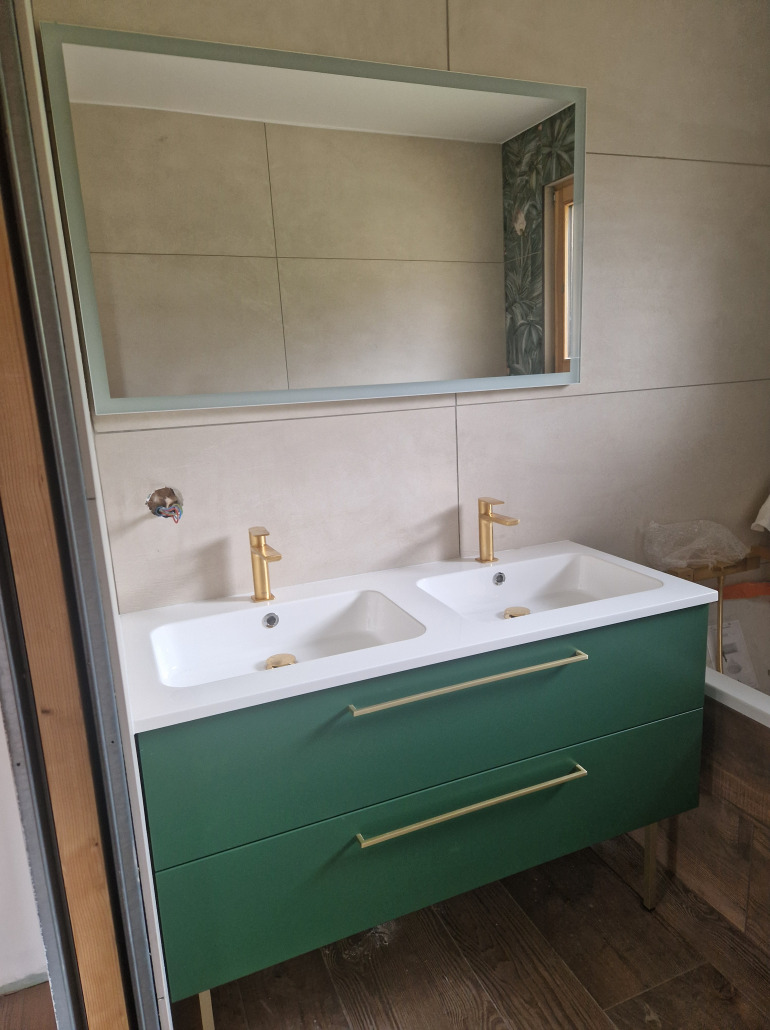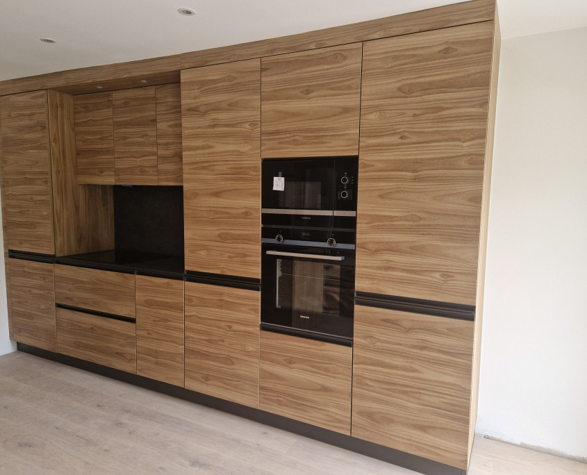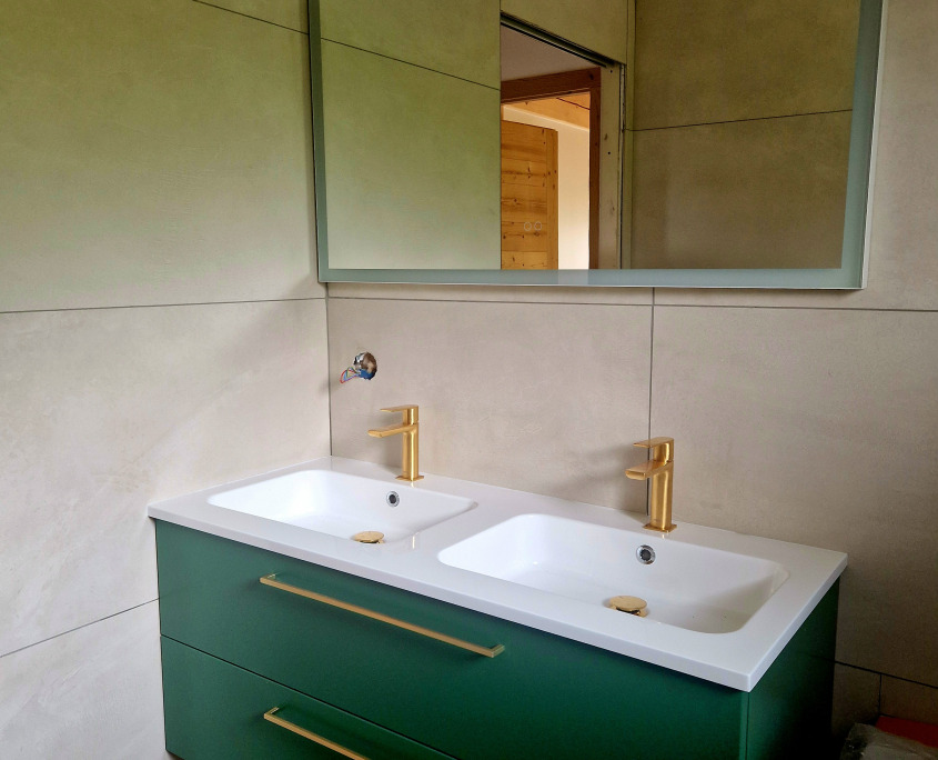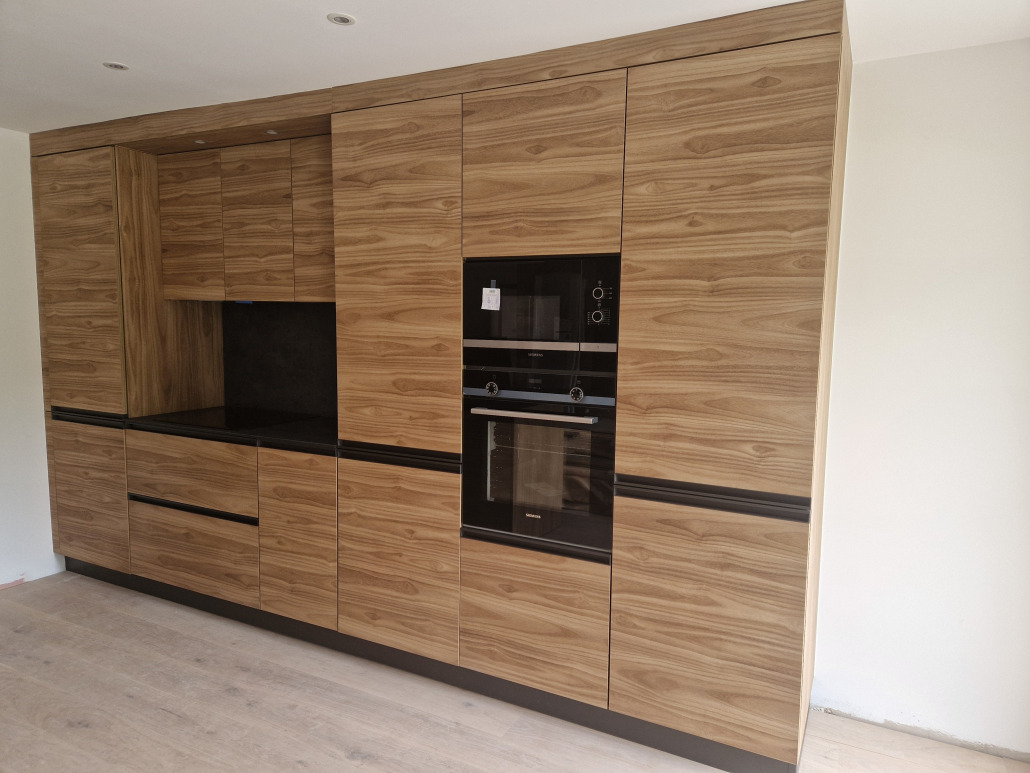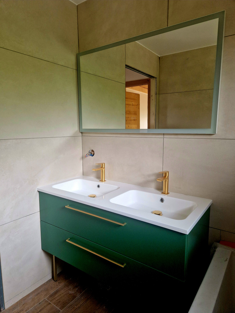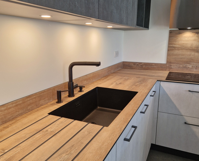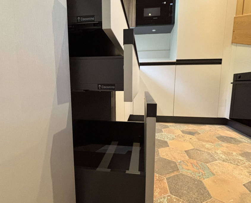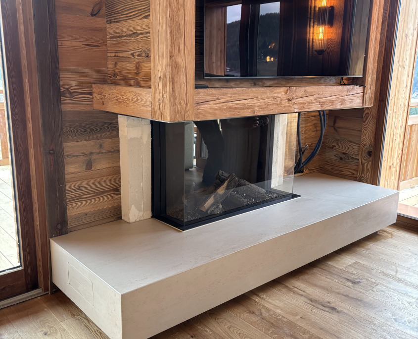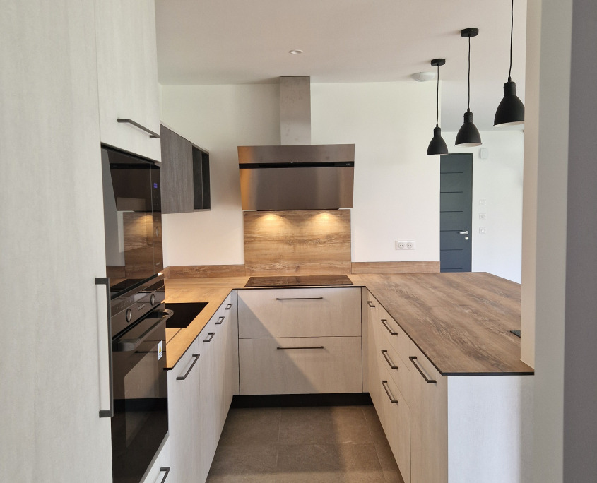 Une cuisine grand format pensée pour conjuguer design contemporain et esprit chalet, au cœur de volumes spectaculaires. Les façades laquées sur mesure, sans poignées, offrent une lecture fluide et élégante, en dialogue avec la chaleur du bois.
